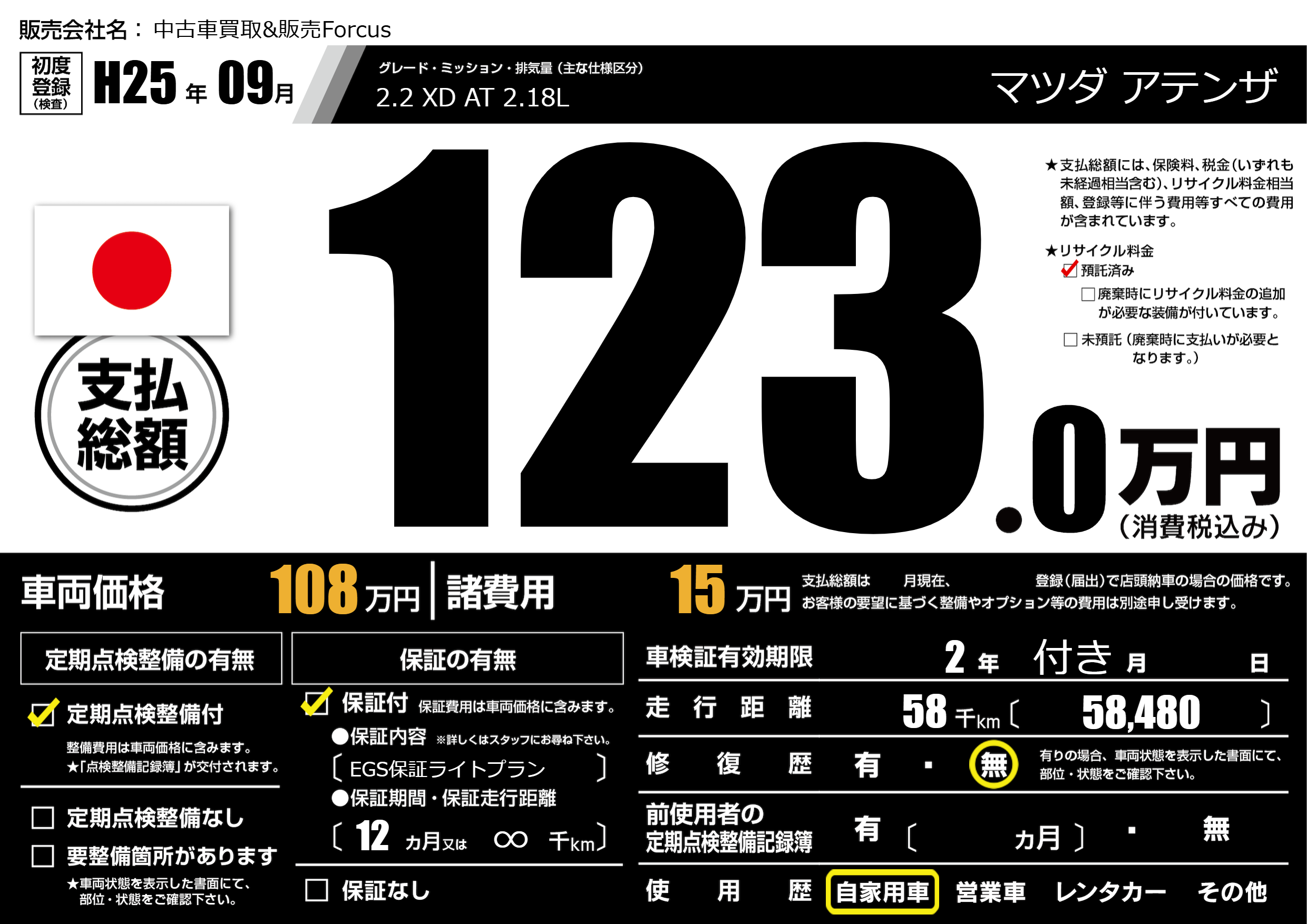 | 走行キロ | 5.8万km | 初年度登録 | H25年09月 |