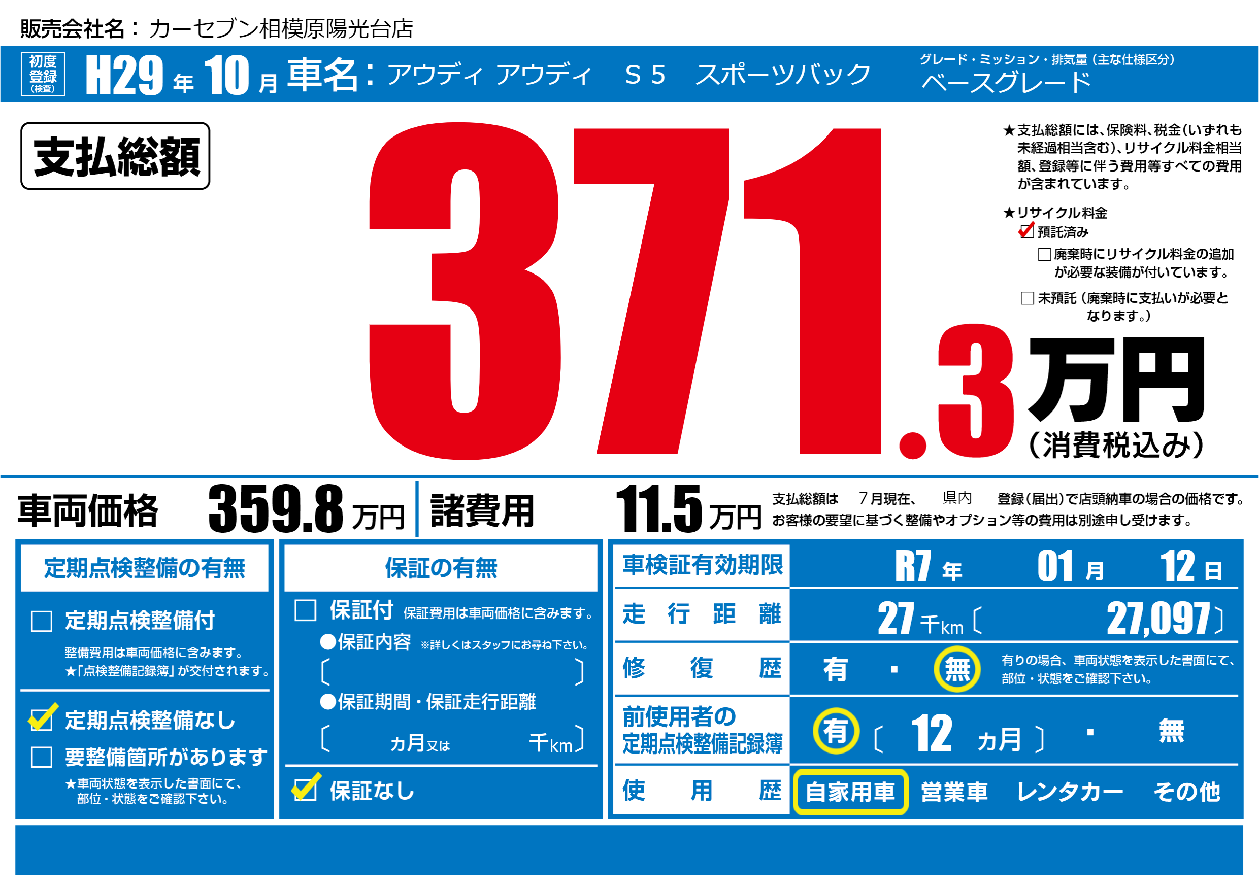 | 車名 | アウディ アウディ S5 スポーツバック | グレード ミッション 排気量 |