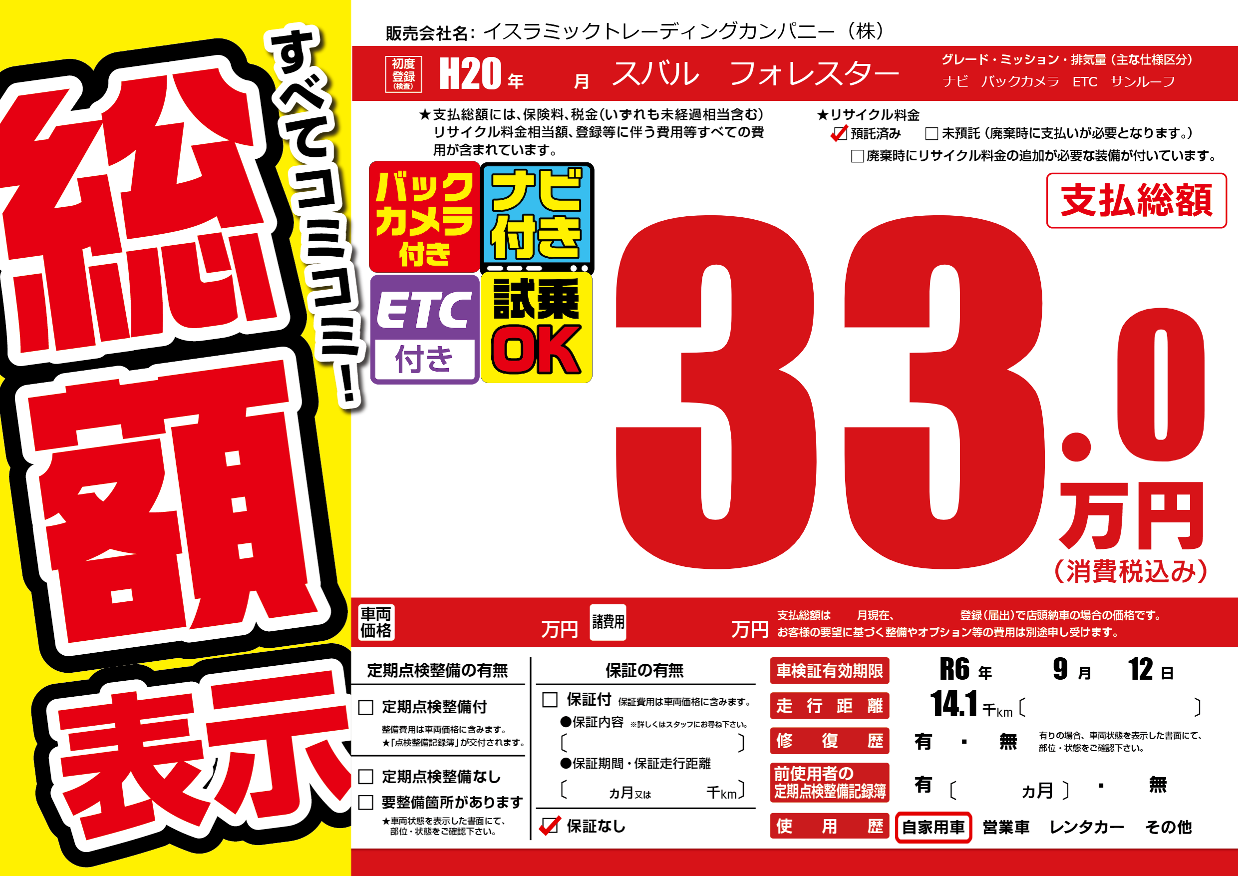 | 車名 | スバル フォレスター | グレード ミッション 排気量 |