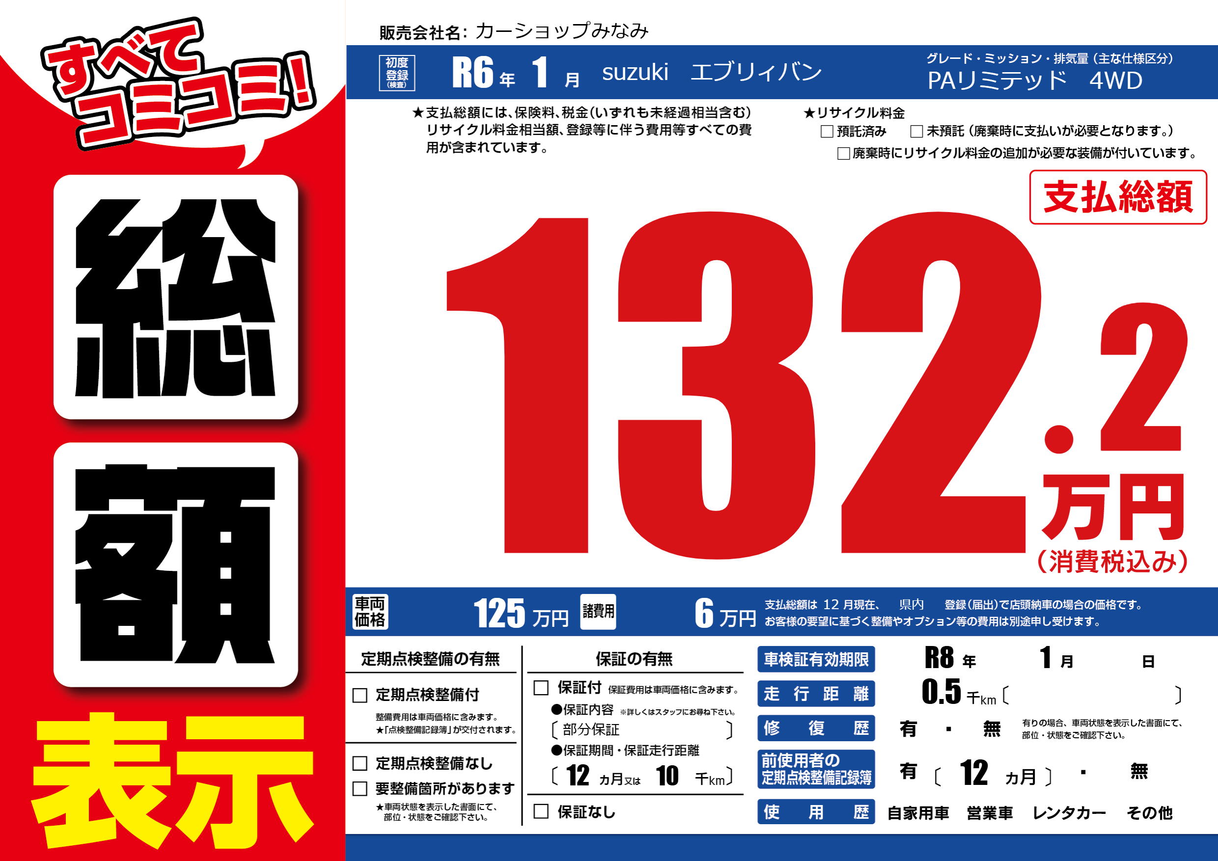 | 車名 | suzuki エブリィバン | グレード ミッション 排気量 |