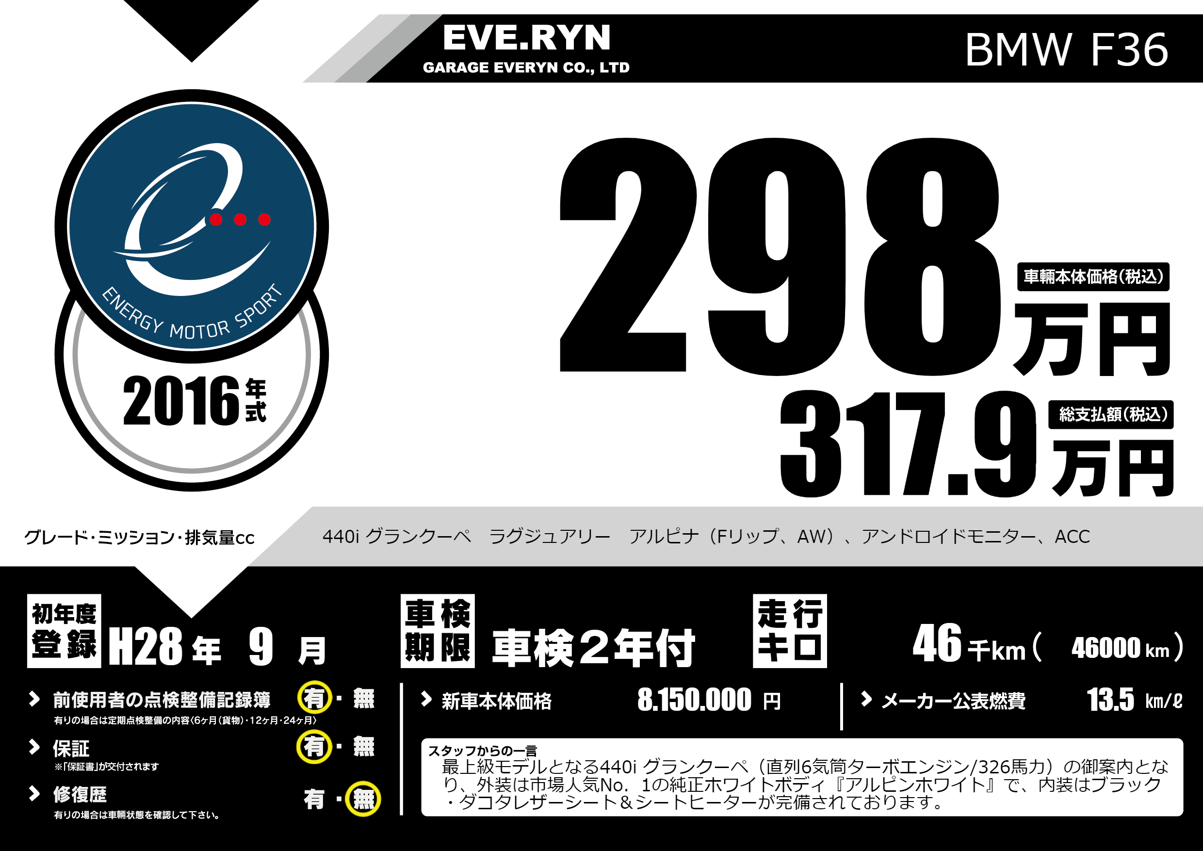 | 車名 | BMW F36 | グレード ミッション 排気量 |