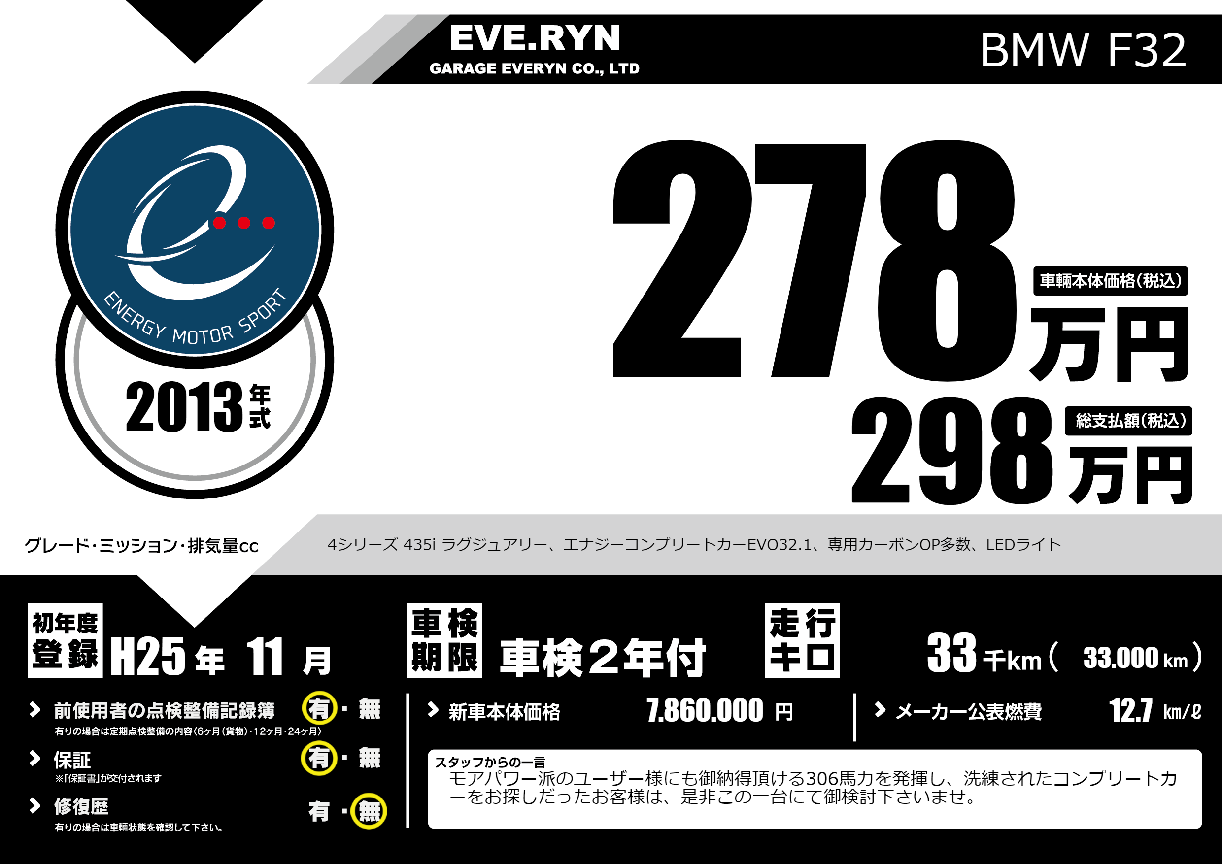 | 車名 | BMW F32 | グレード ミッション 排気量 |
