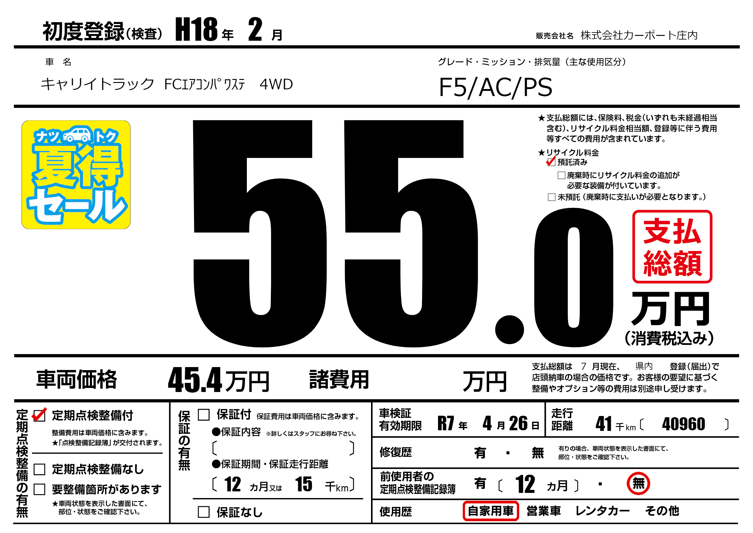| 走行キロ | 4.1万km | 初年度登録 | H18年2月 |
