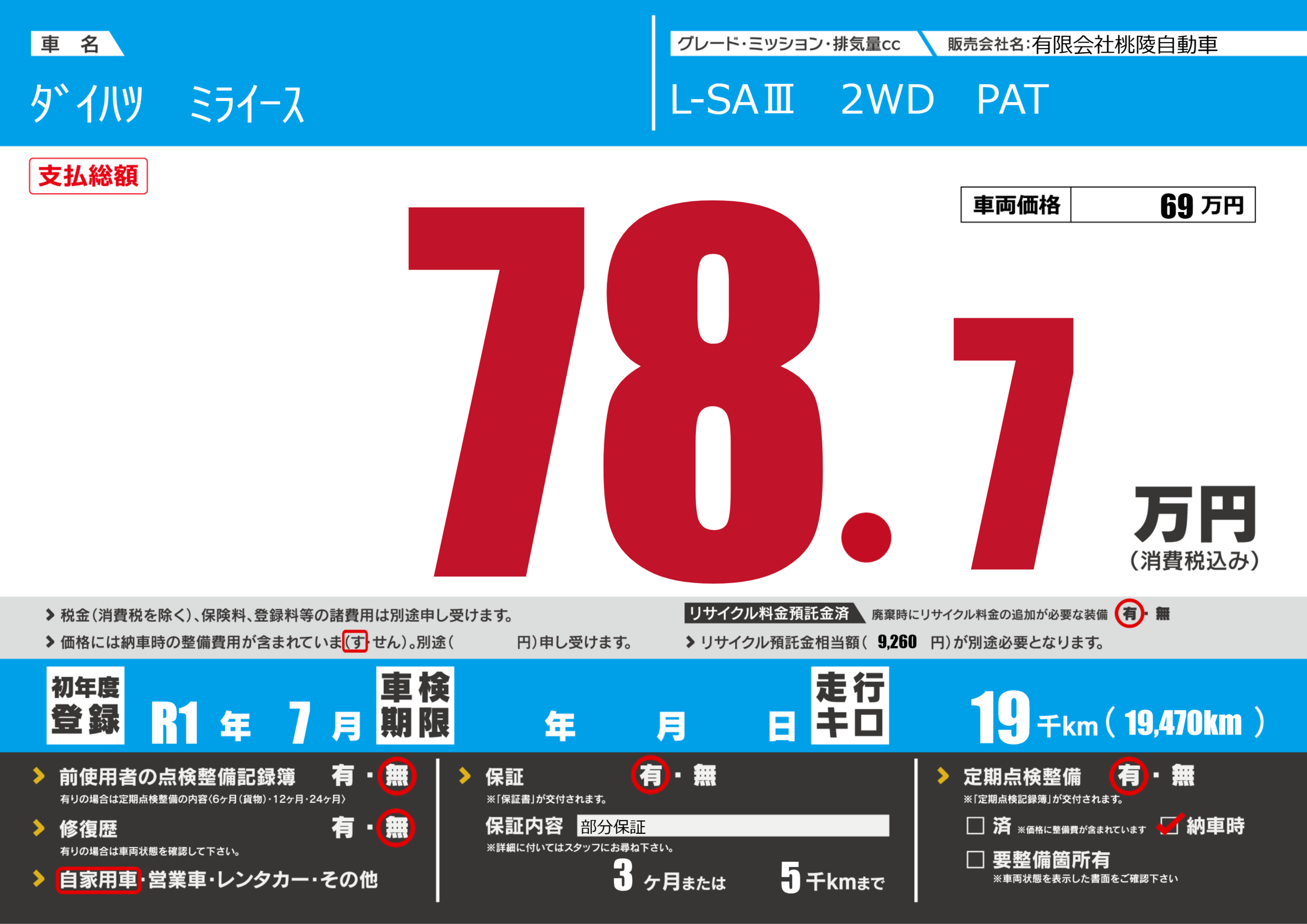 保証付き 保証内容(部分保証) 3ヶ月または(5)千kmまで |