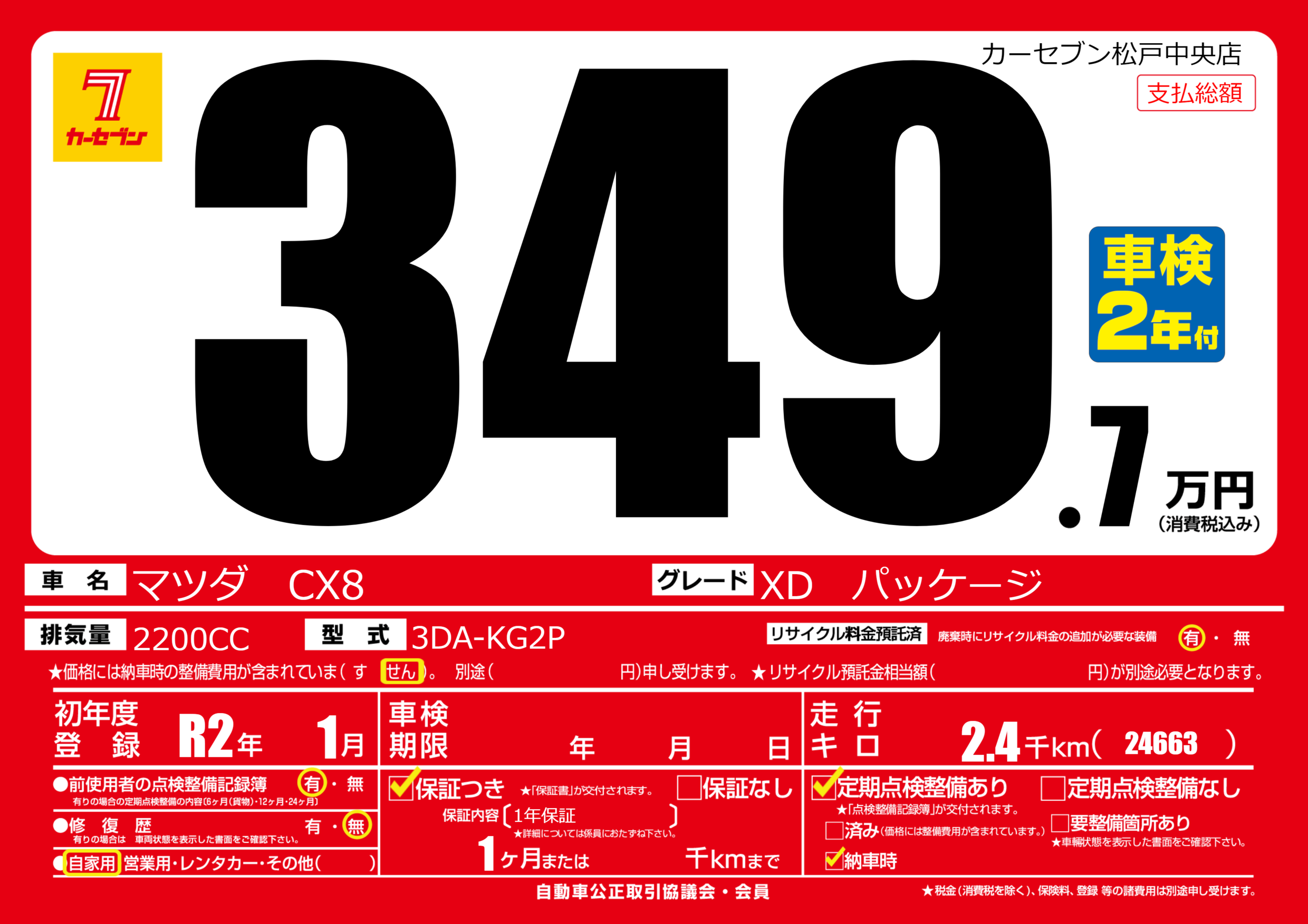 | 車名 | マツダ CX8 | グレード ミッション 排気量 |