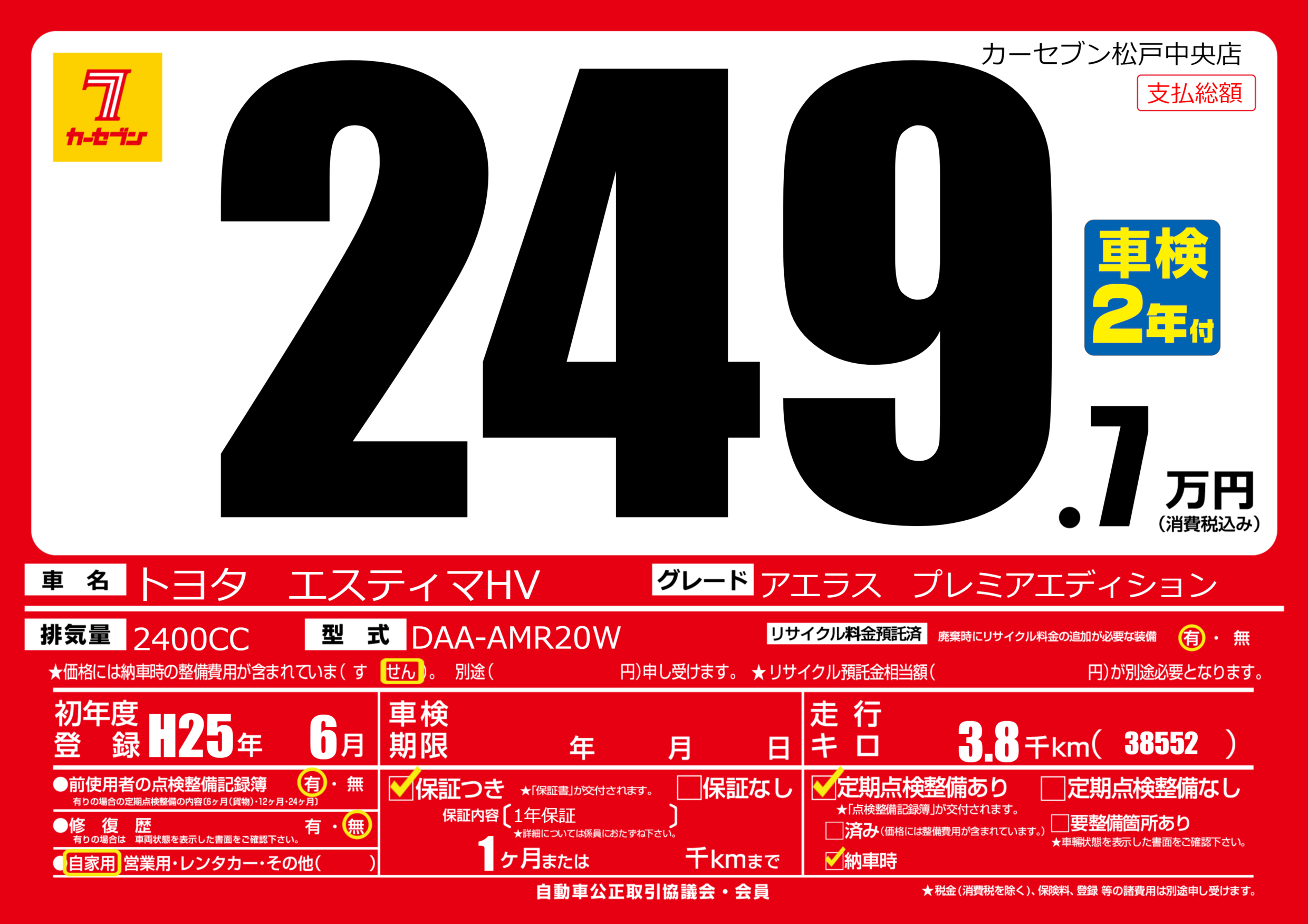 | 車名 | トヨタ エスティマHV | グレード ミッション 排気量 |