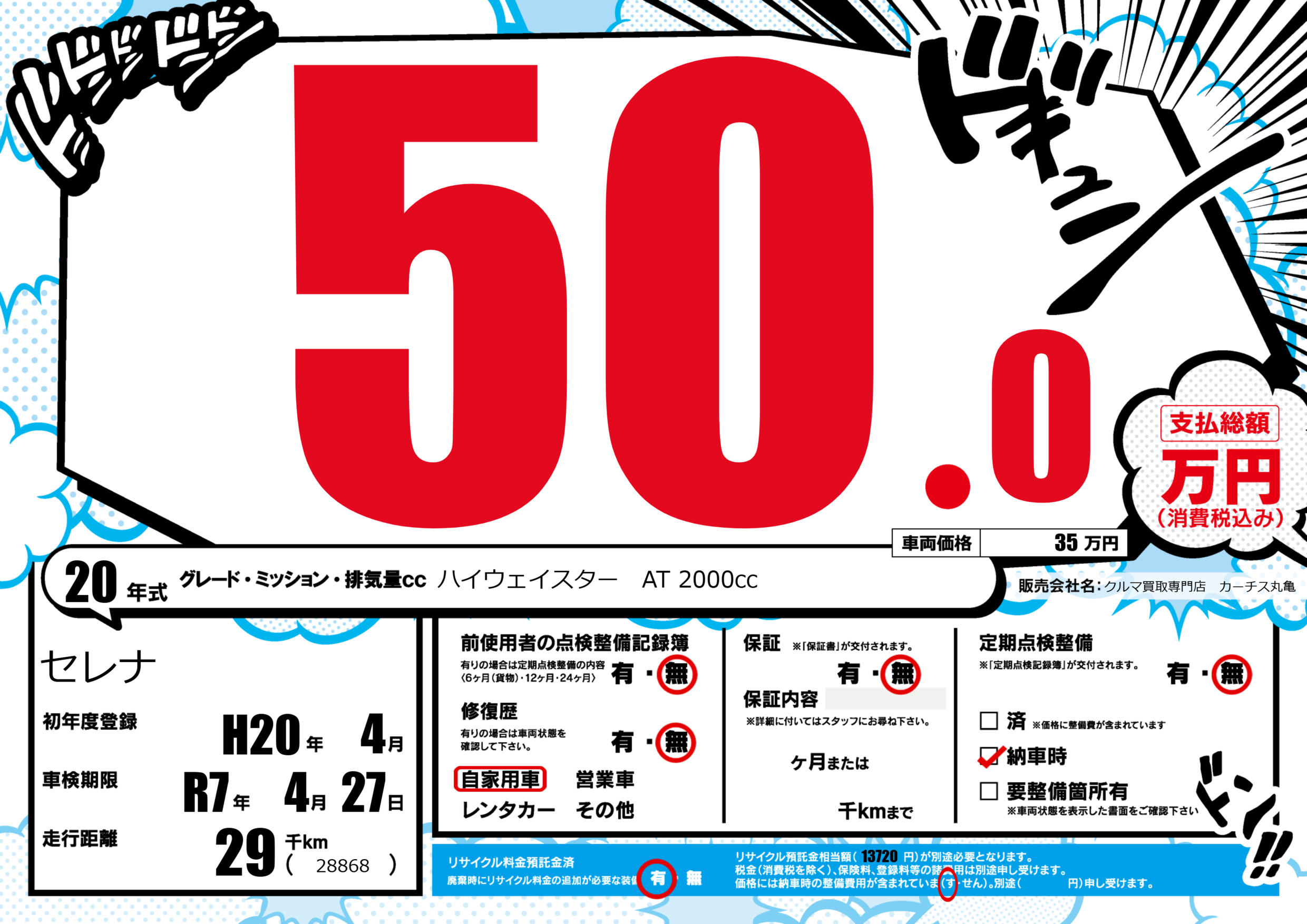 | 走行キロ | 2.9万km | 初年度登録 | H20年4月 |