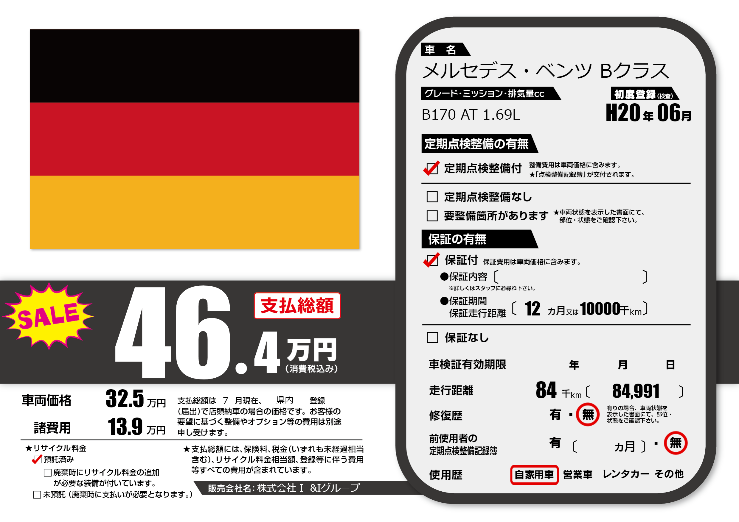 保証付き 保証内容(---) 12ヶ月または(10000)千kmまで |