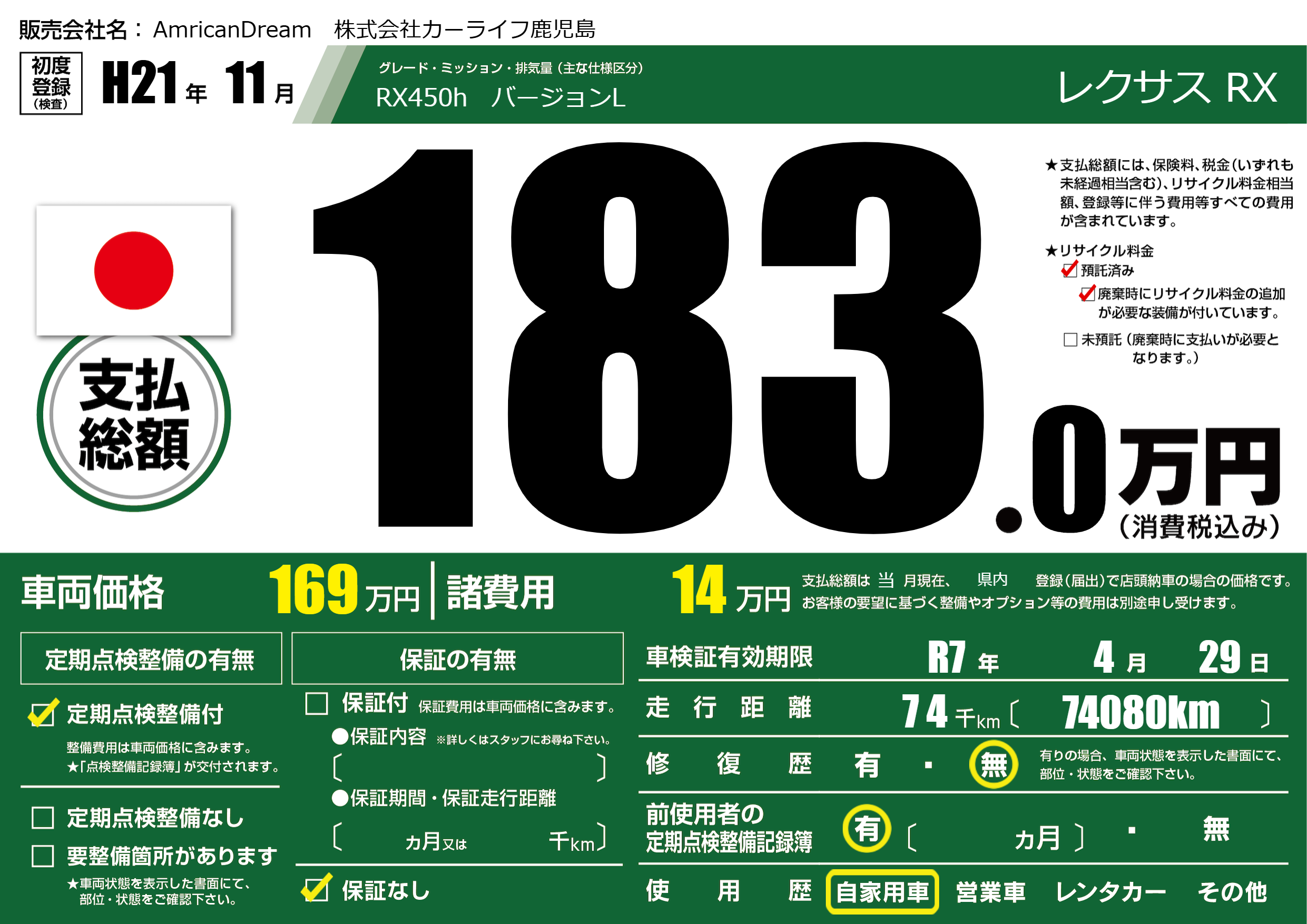 | 車検制限 | R7年 4月 29日 | ||