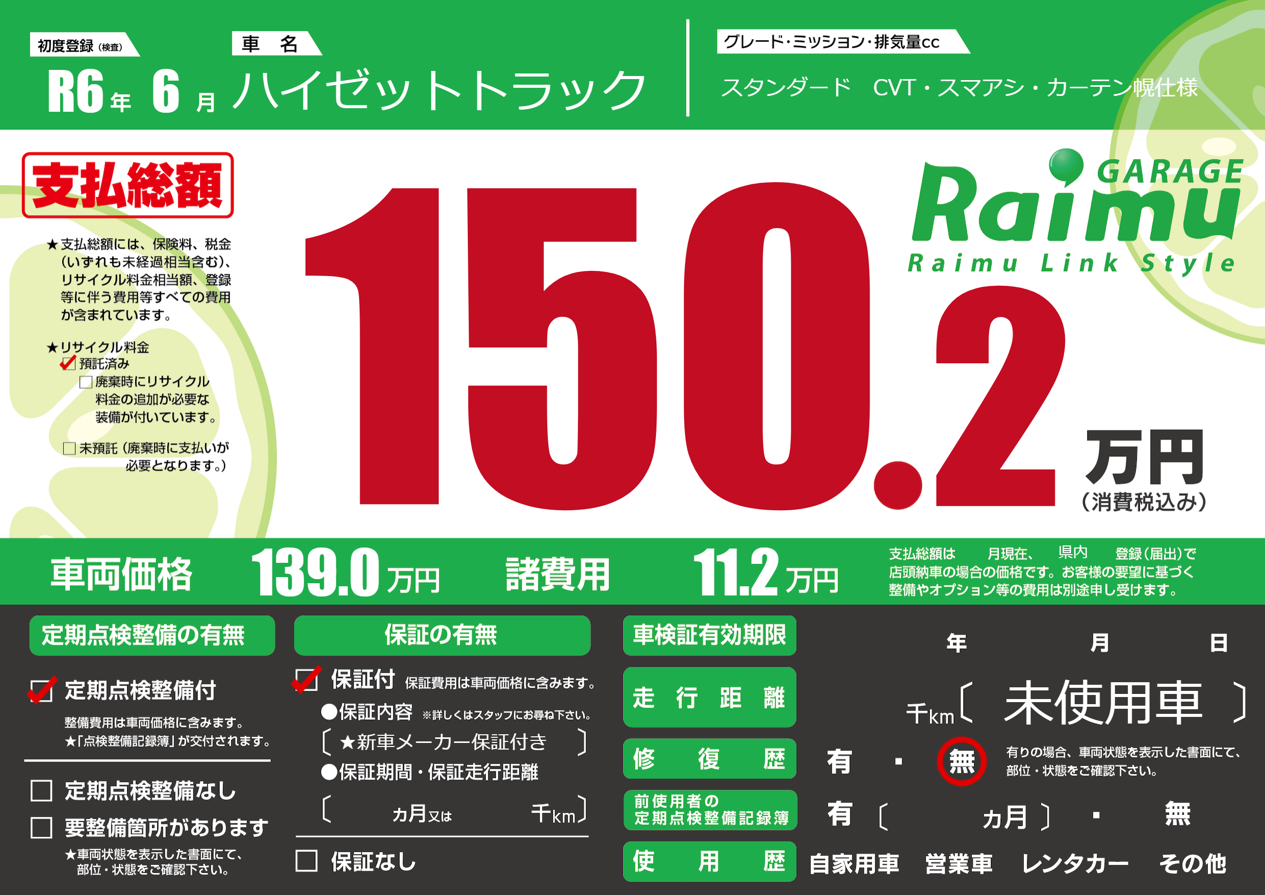 保証付き 保証内容(★新車メーカー保証付き) ---ヶ月または()千kmまで |