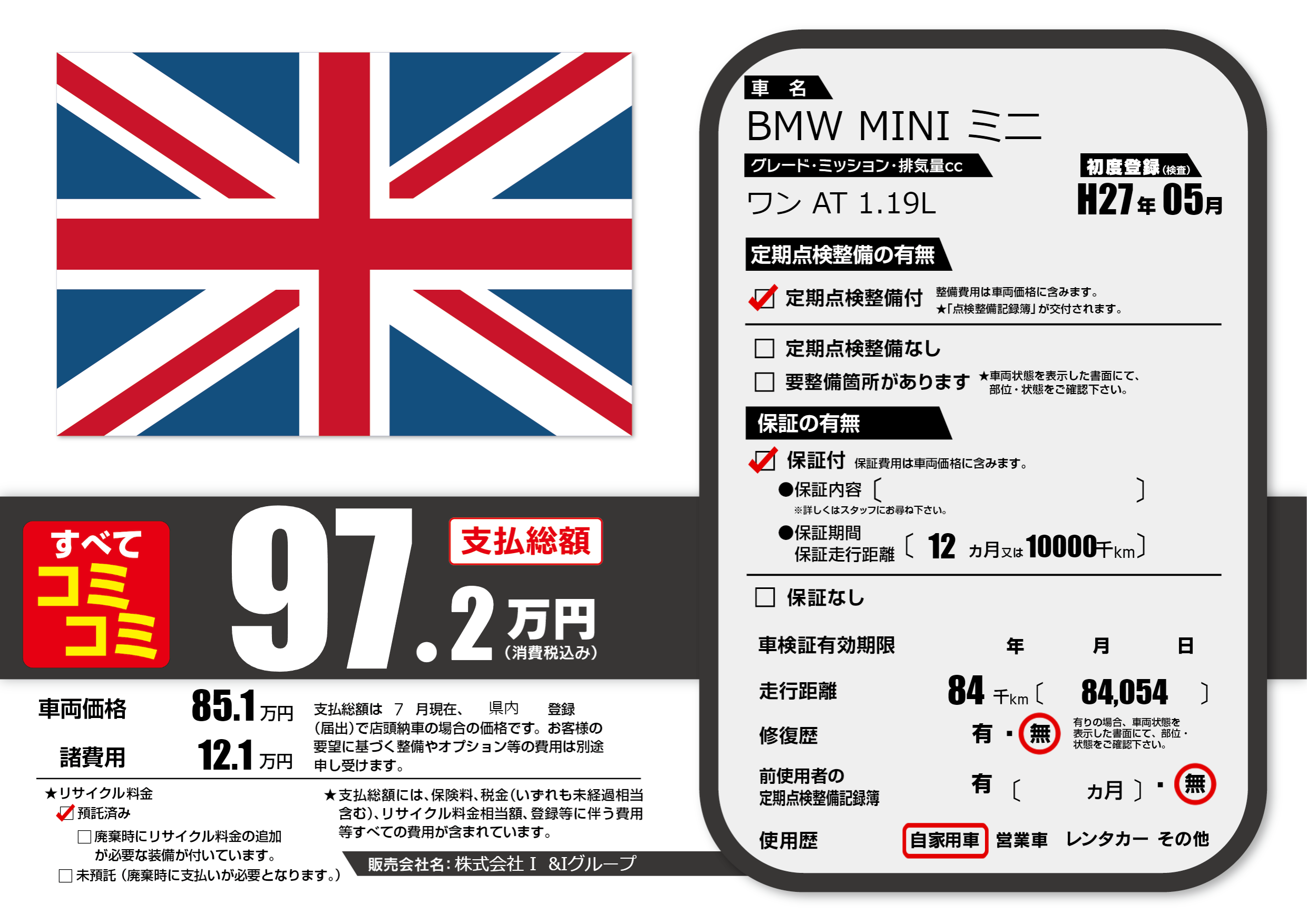 | 車名 | BMW MINI ミニ | グレード ミッション 排気量 |