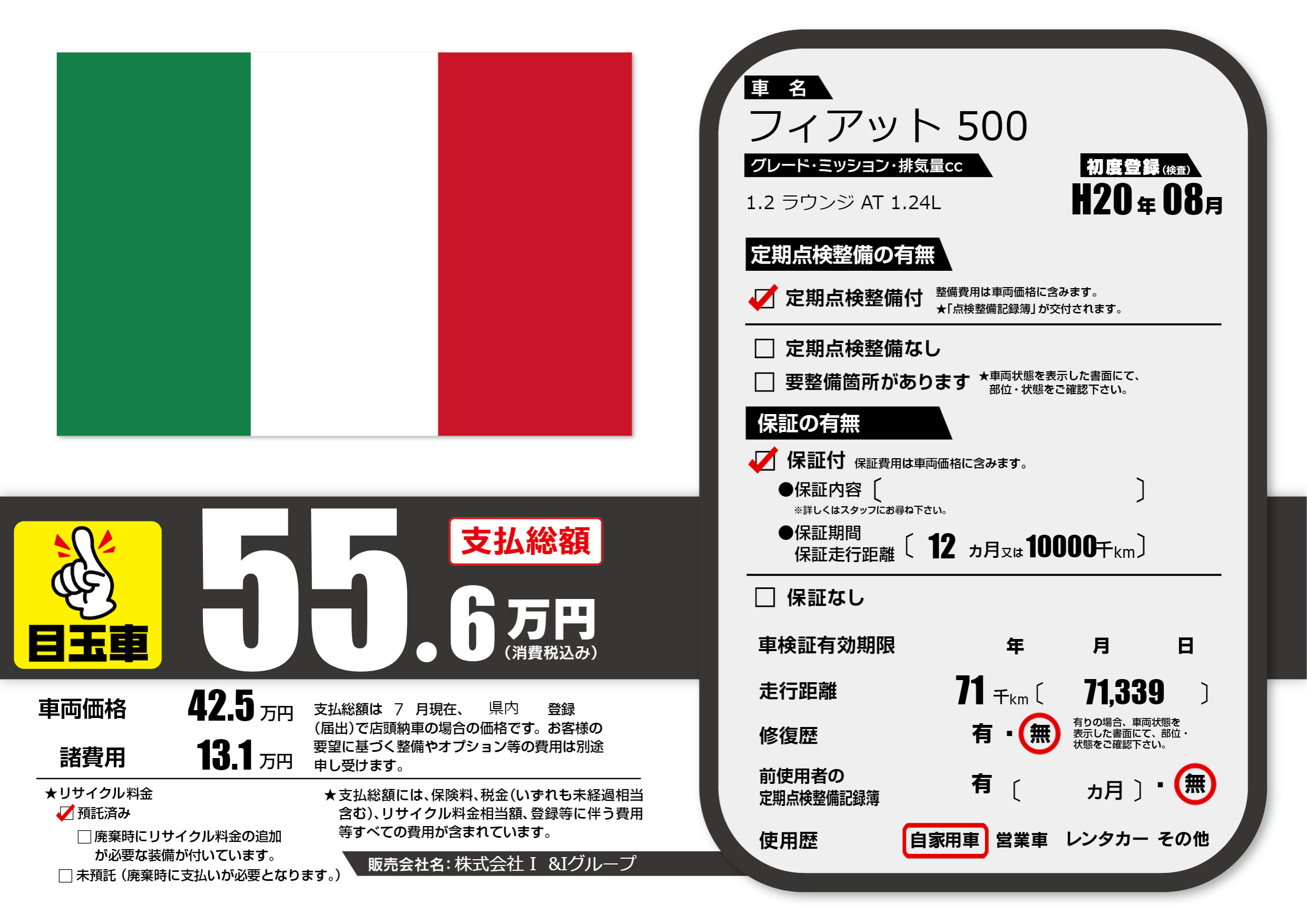 | 車名 | フィアット 500 | グレード ミッション 排気量 |