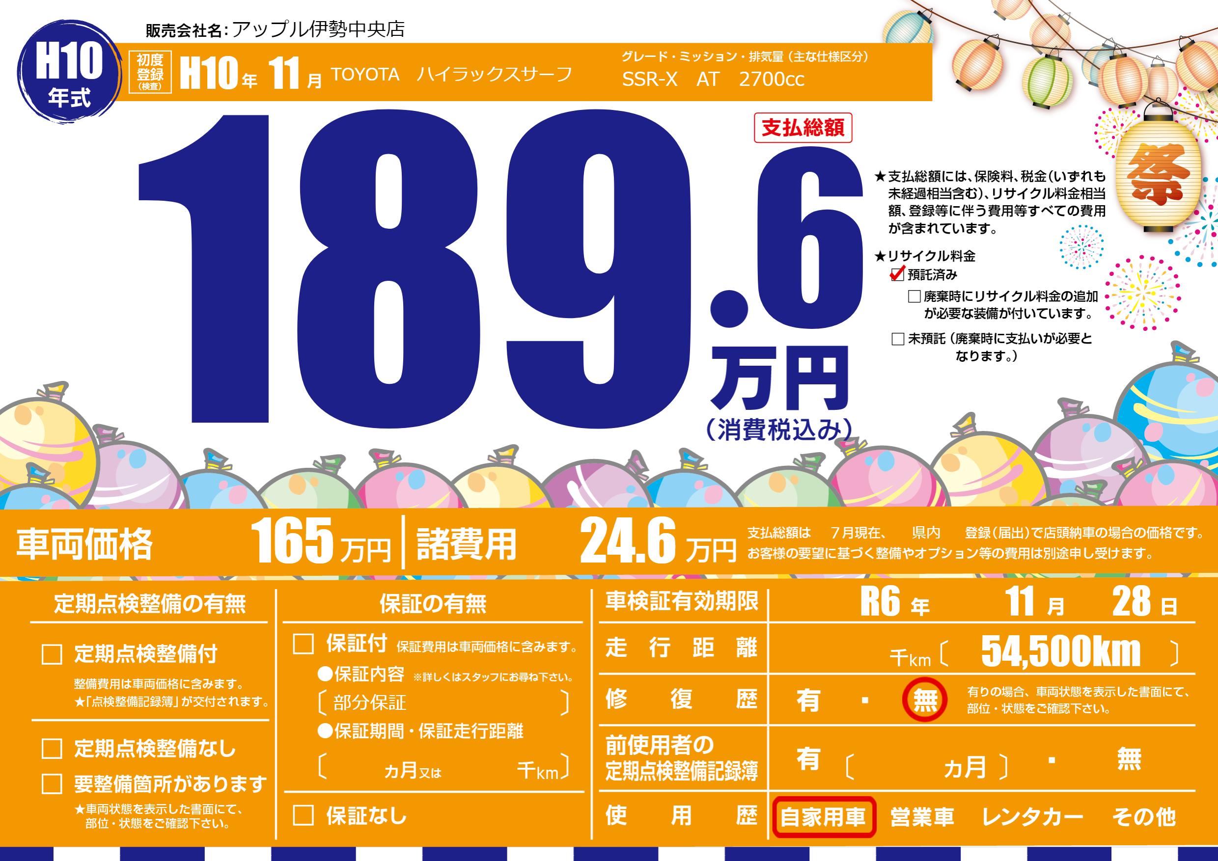 | 車名 | TOYOTA ハイラックスサーフ | グレード ミッション 排気量 |