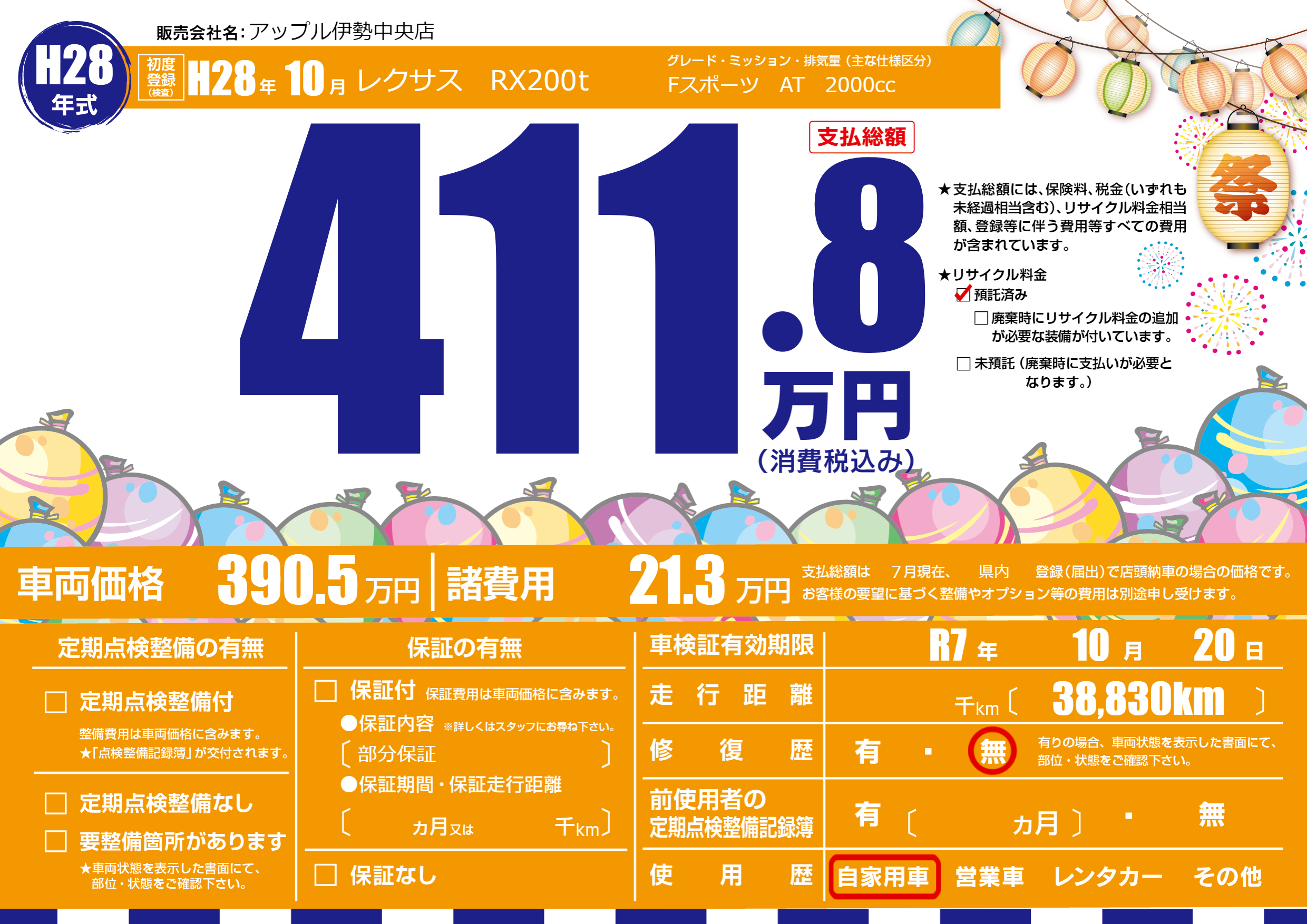 | 車名 | レクサス RX200t | グレード ミッション 排気量 |