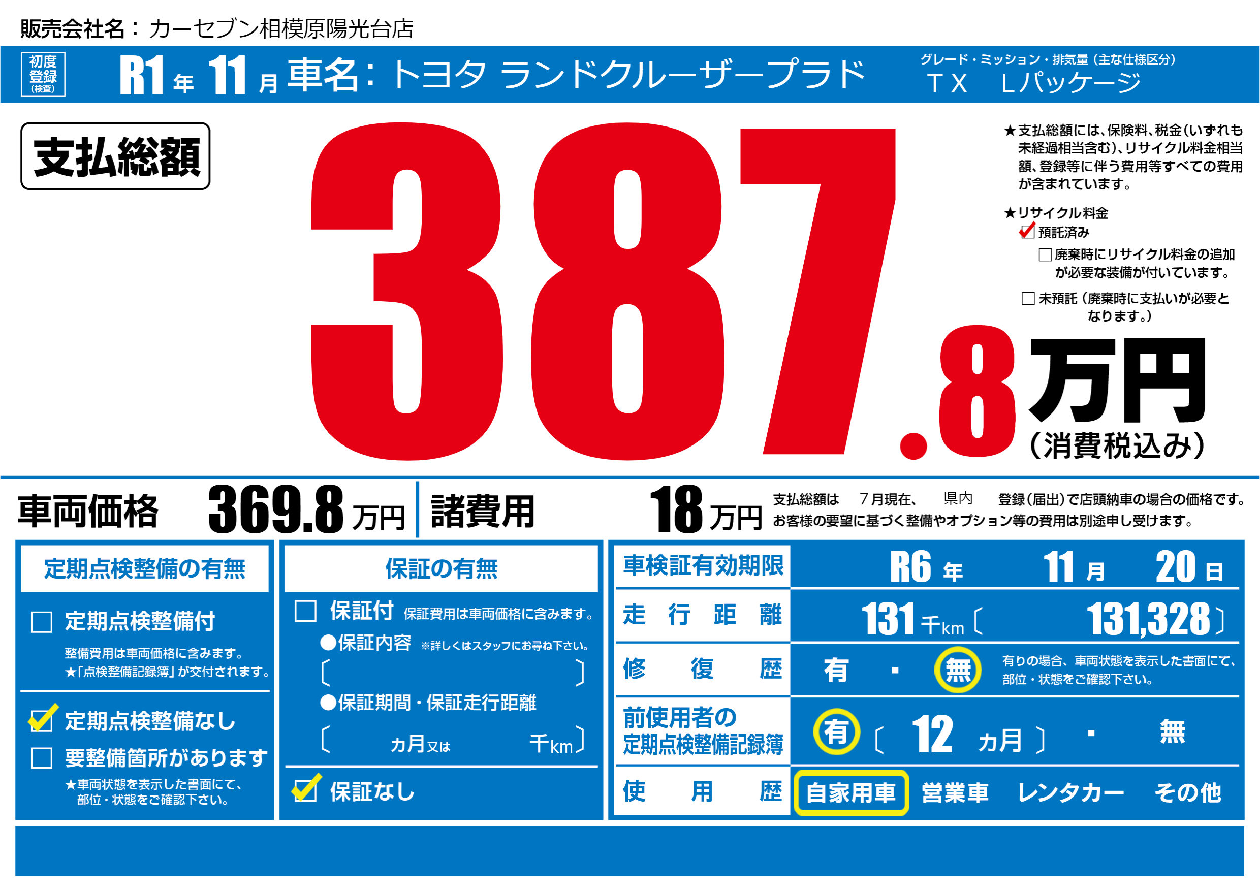 | 車名 | トヨタ ランドクルーザープラド | グレード ミッション 排気量 |