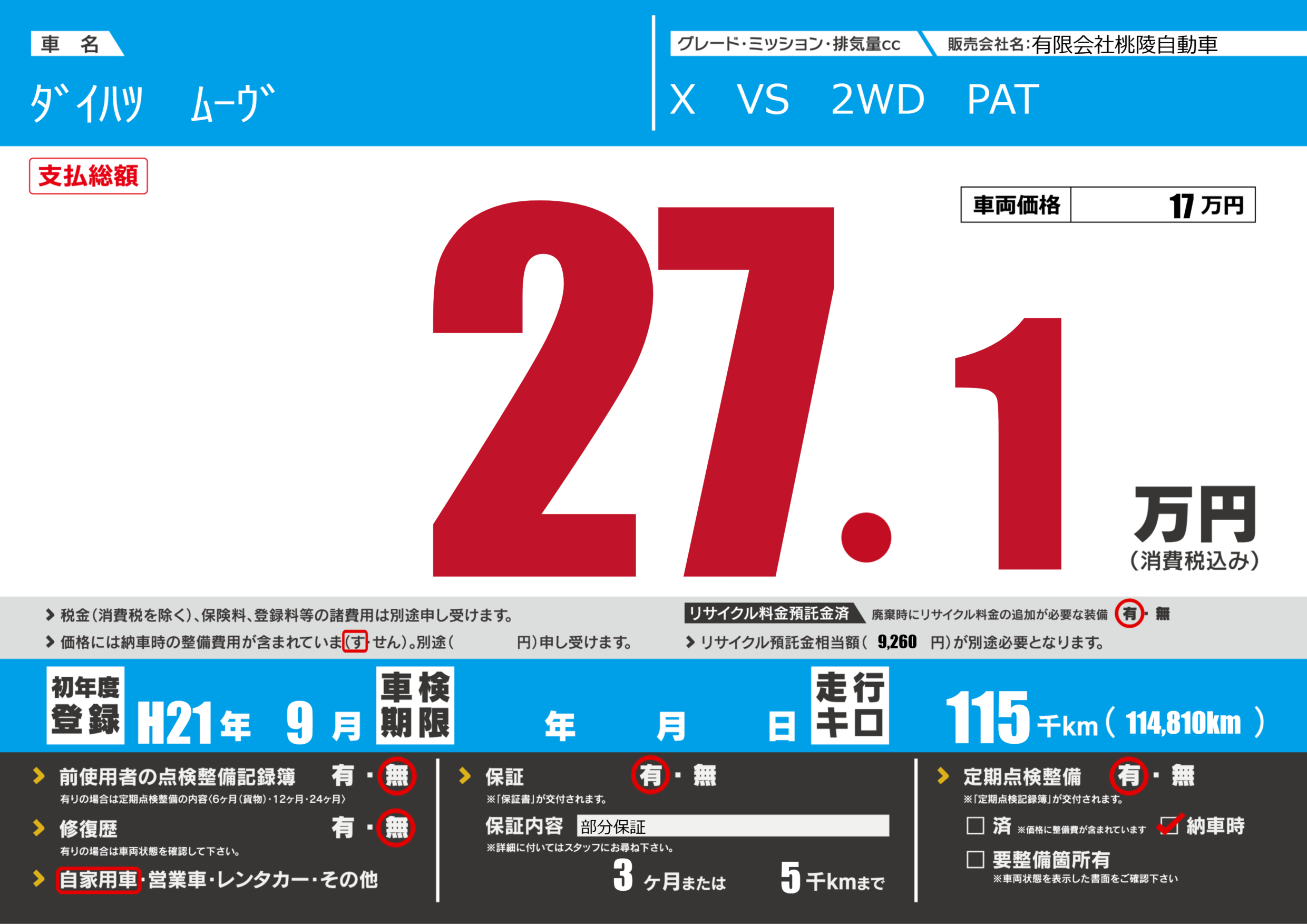 保証付き 保証内容(部分保証) 3ヶ月または(5)千kmまで |