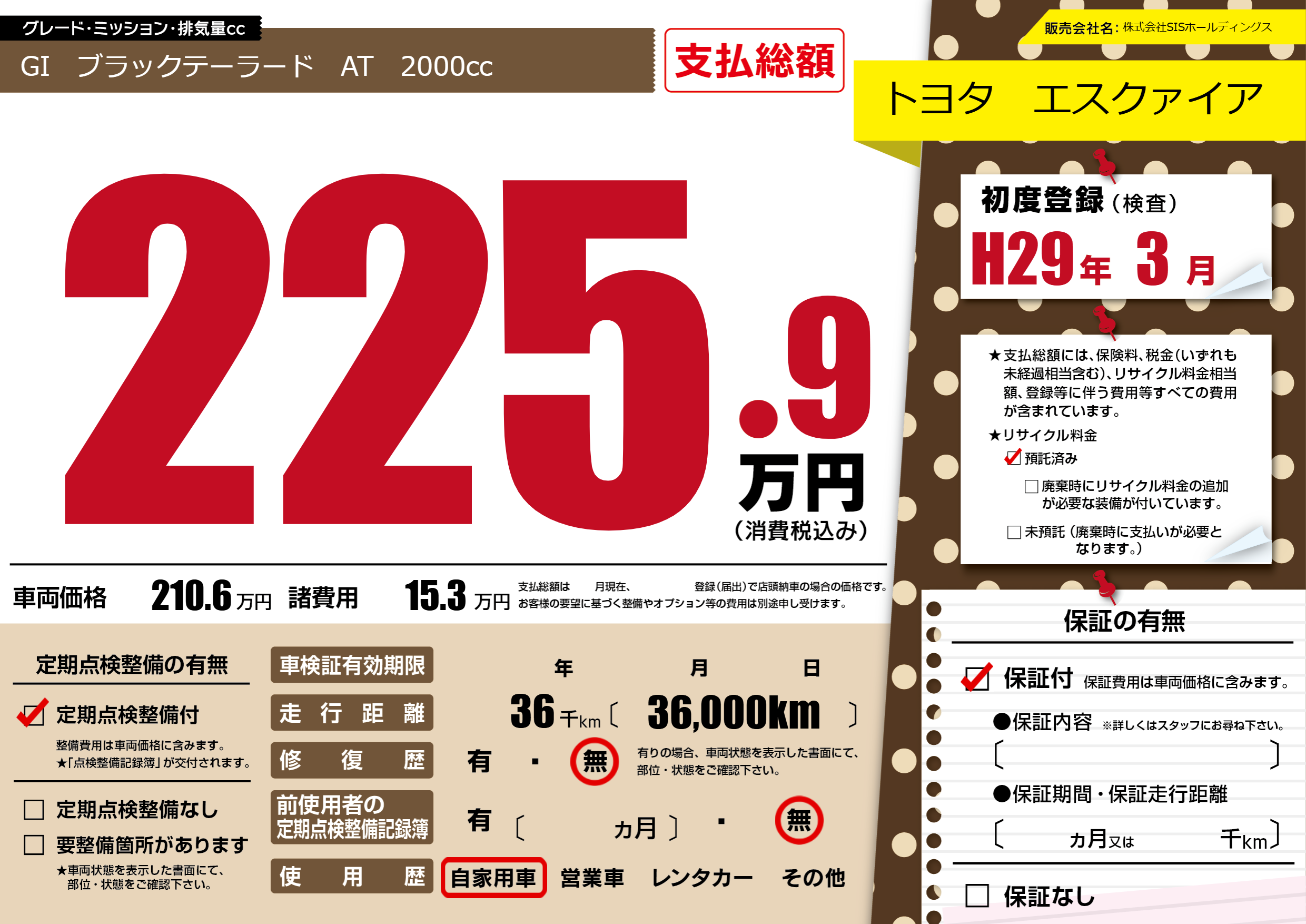 | 車名 | トヨタ エスクァイア | グレード ミッション 排気量 |