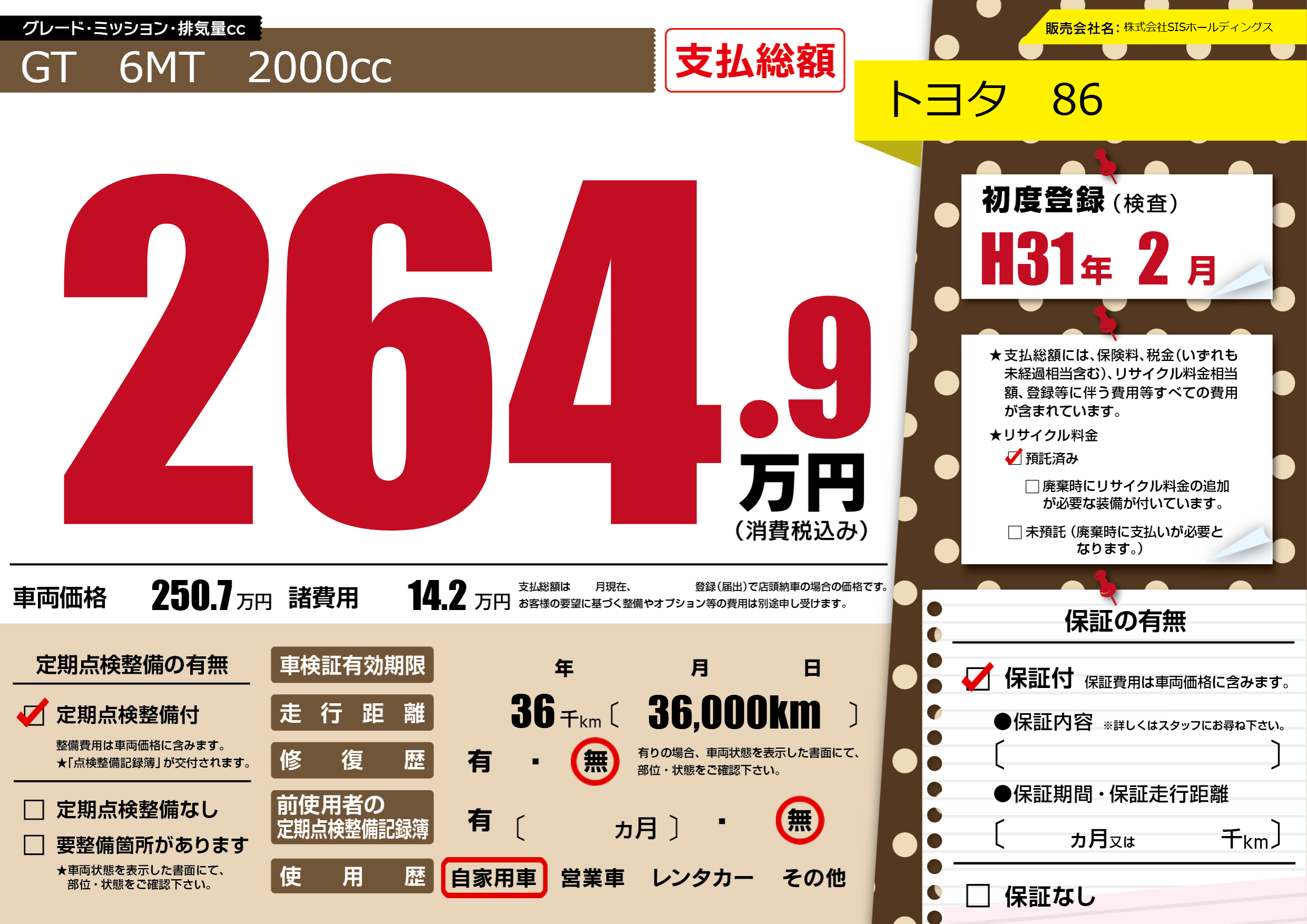 | 車名 | トヨタ 86 | グレード ミッション 排気量 |