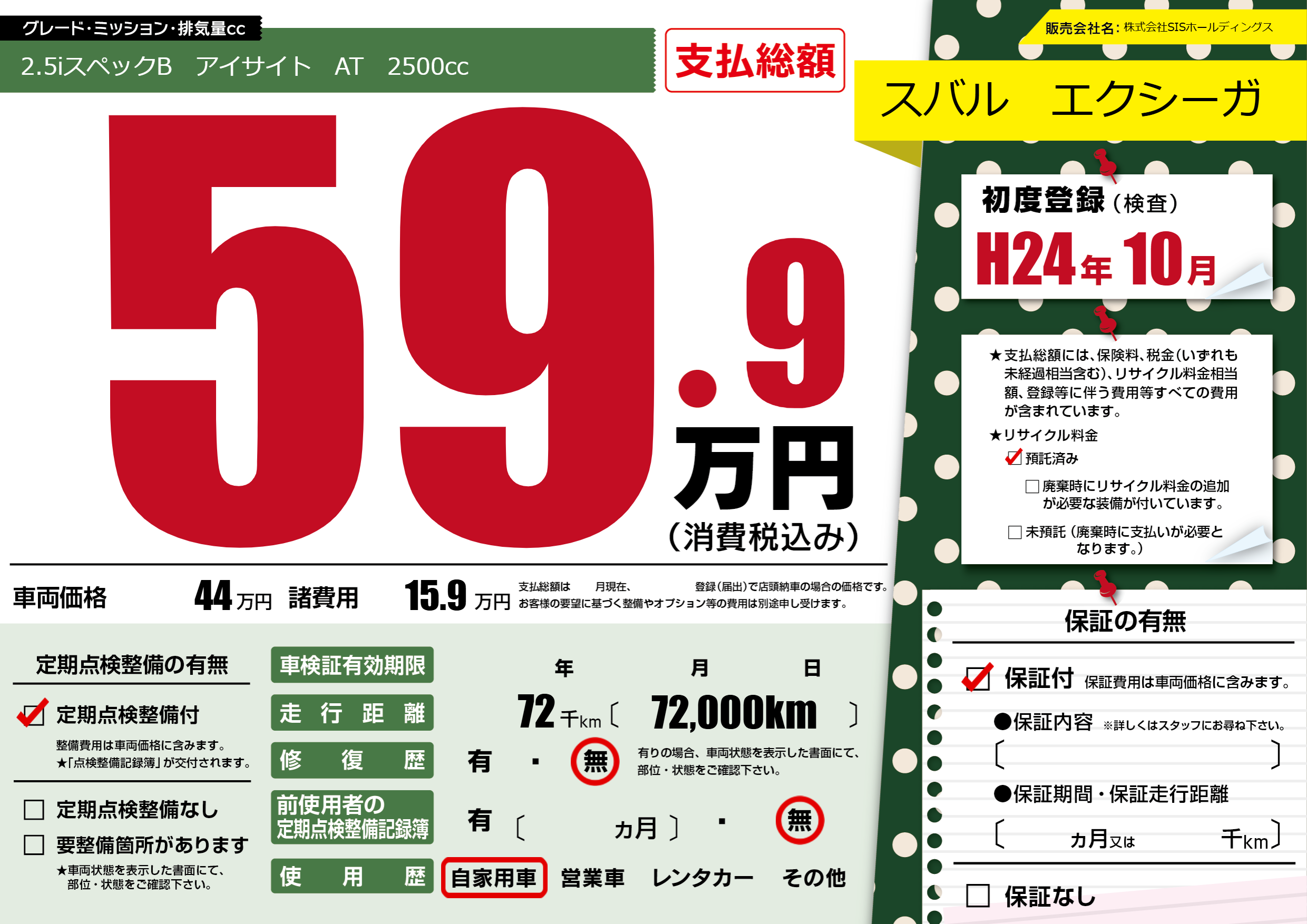 | 車名 | スバル エクシーガ | グレード ミッション 排気量 |