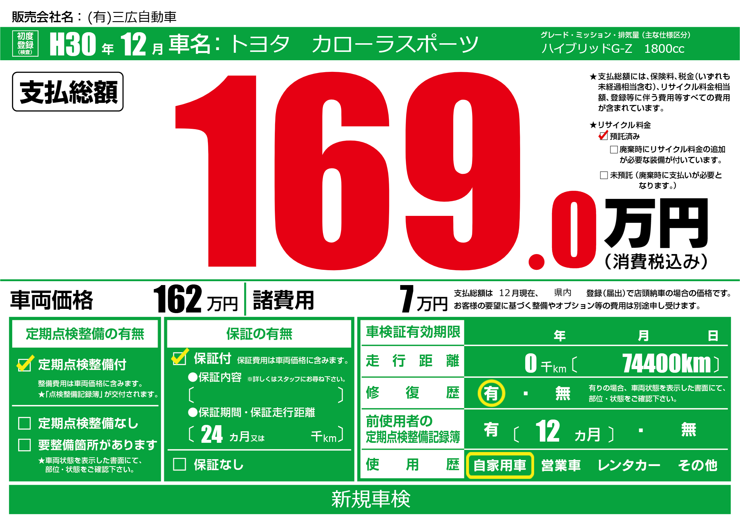 | 車名 | トヨタ カローラスポーツ | グレード ミッション 排気量 |