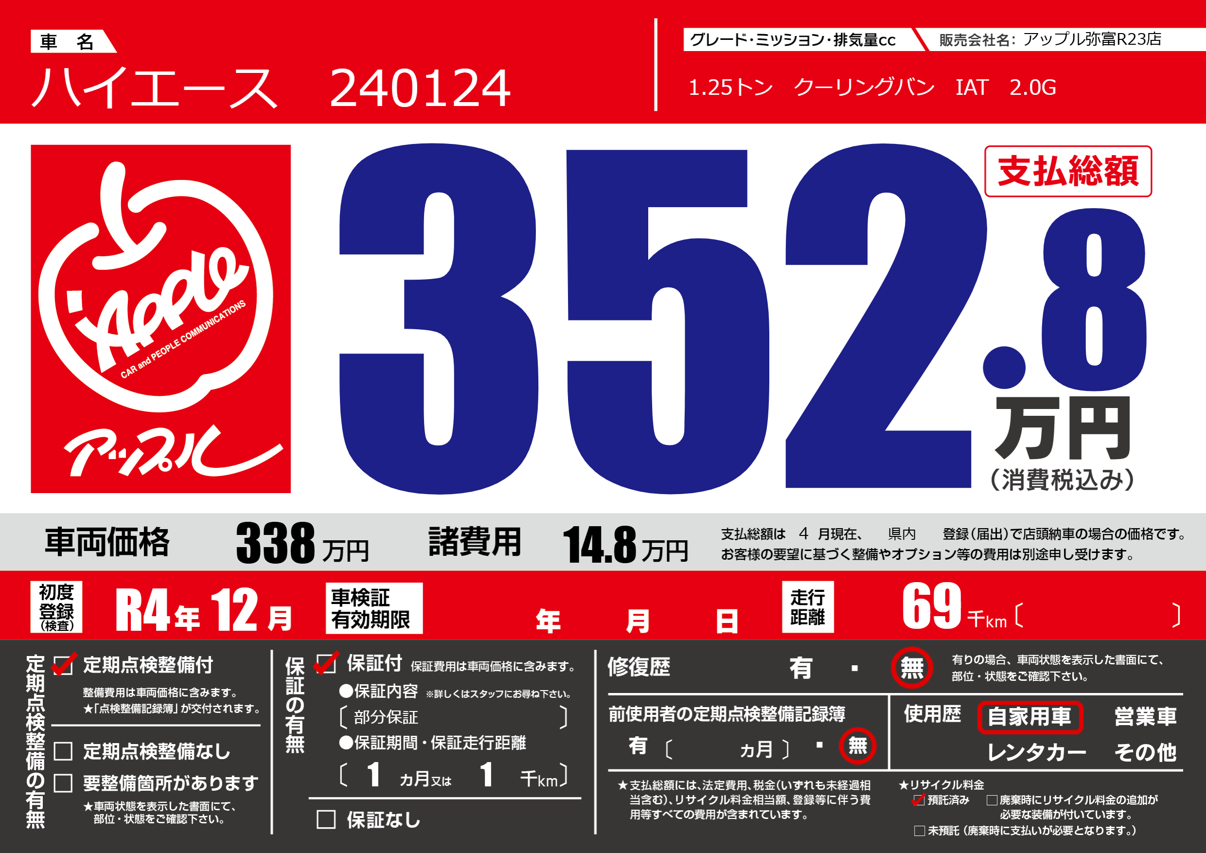 | 車名 | ハイエース 240124 | グレード ミッション 排気量 |