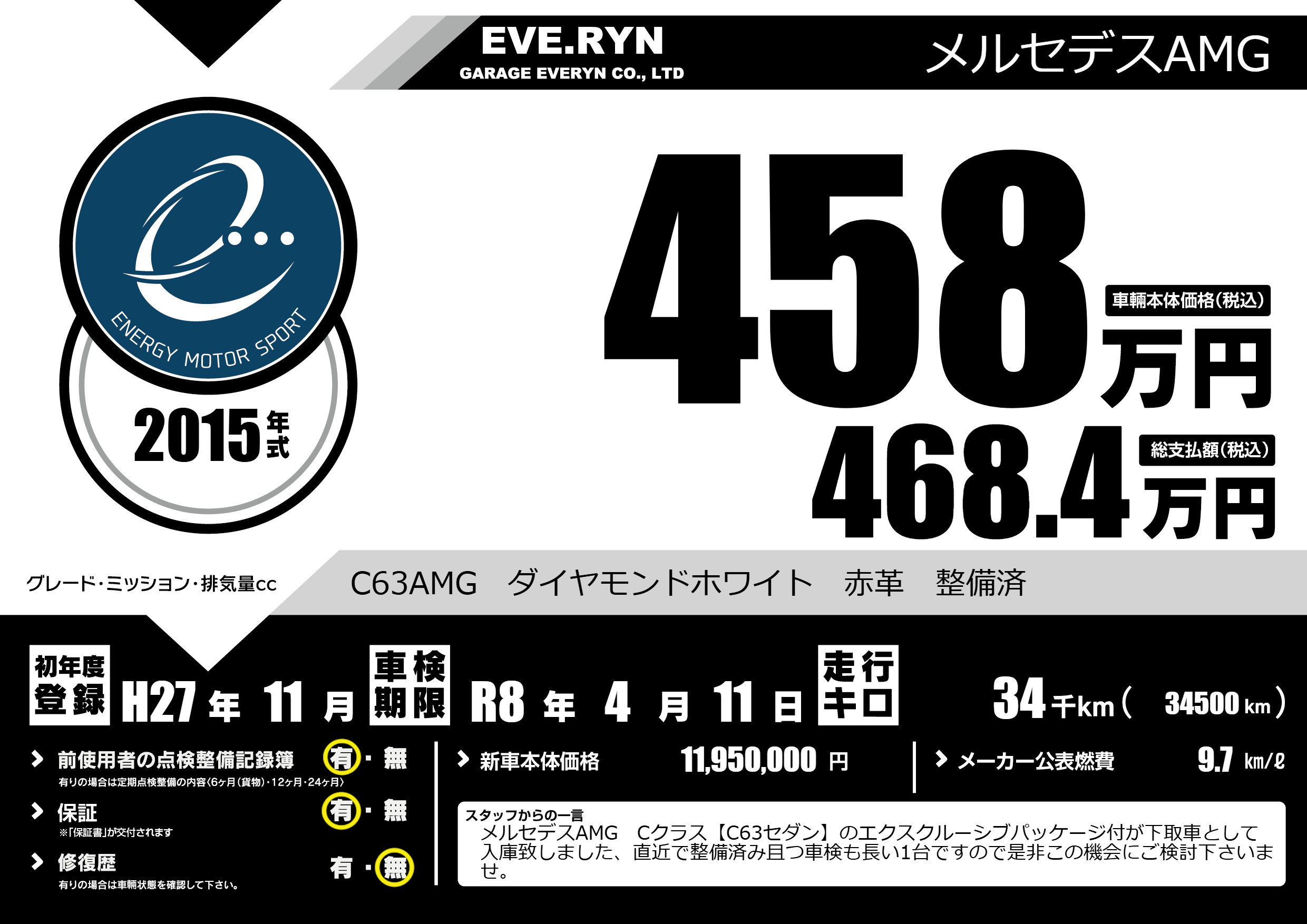C63AMG ダイヤモンドホワイト 赤革 整備済 |