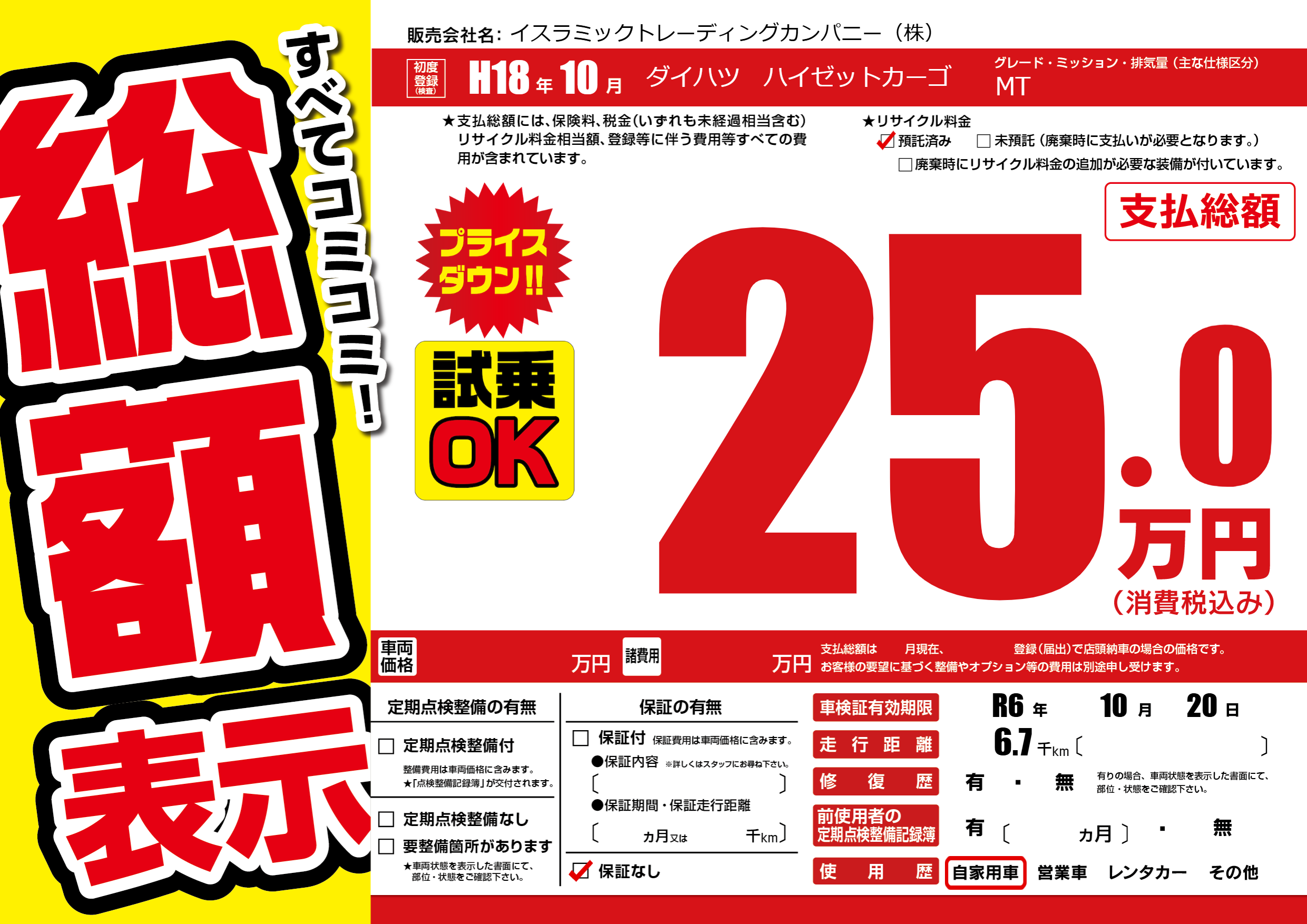 | 車名 | ダイハツ ハイゼットカーゴ | グレード ミッション 排気量 |