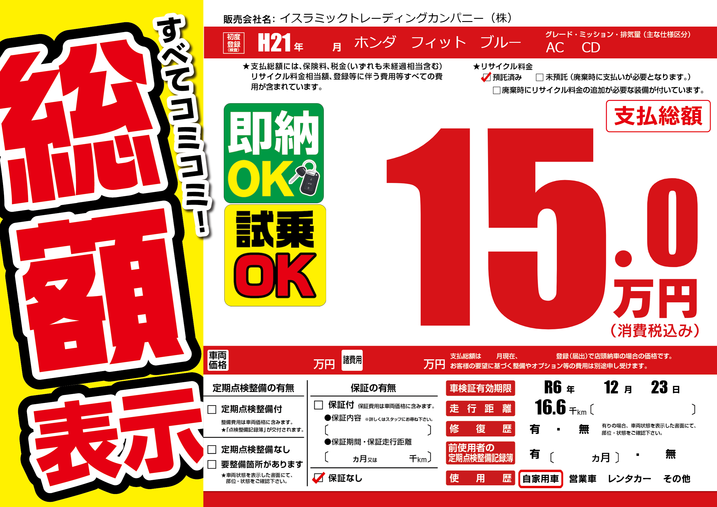 | 車名 | ホンダ フィット ブルー | グレード ミッション 排気量 |