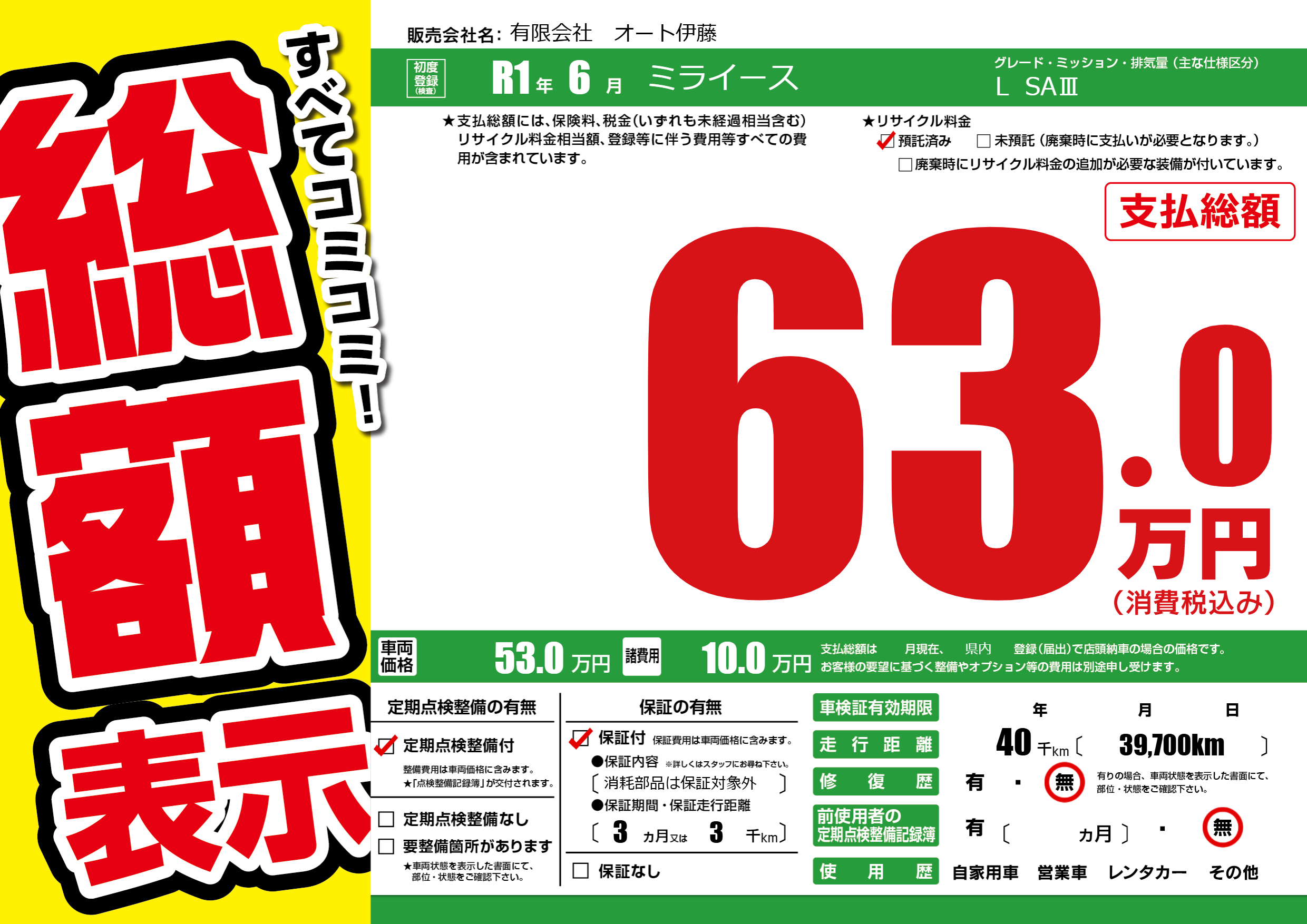| 車名 | ミライース | グレード ミッション 排気量 |
