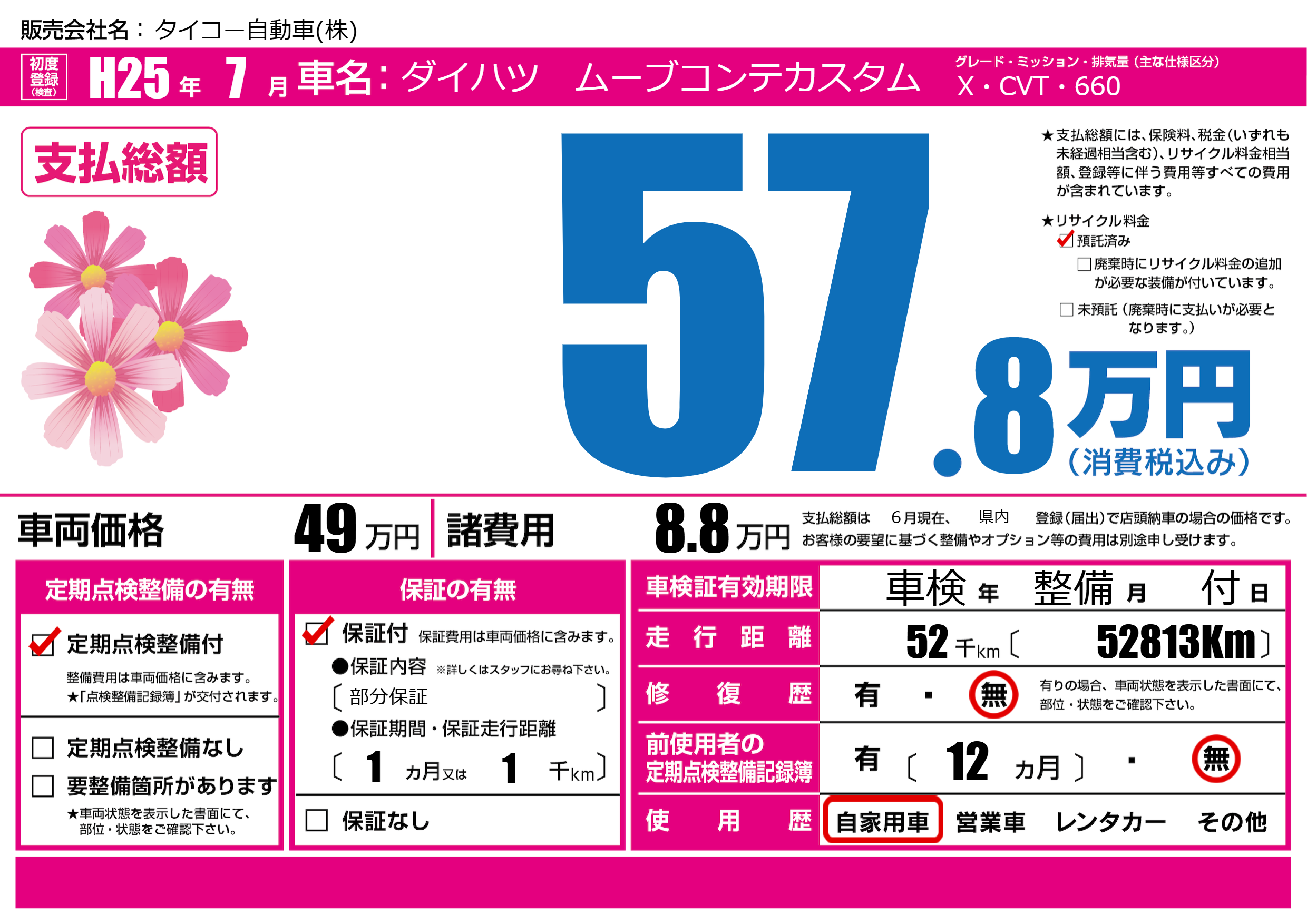 | 車名 | ダイハツ ムーブコンテカスタム | グレード ミッション 排気量 |