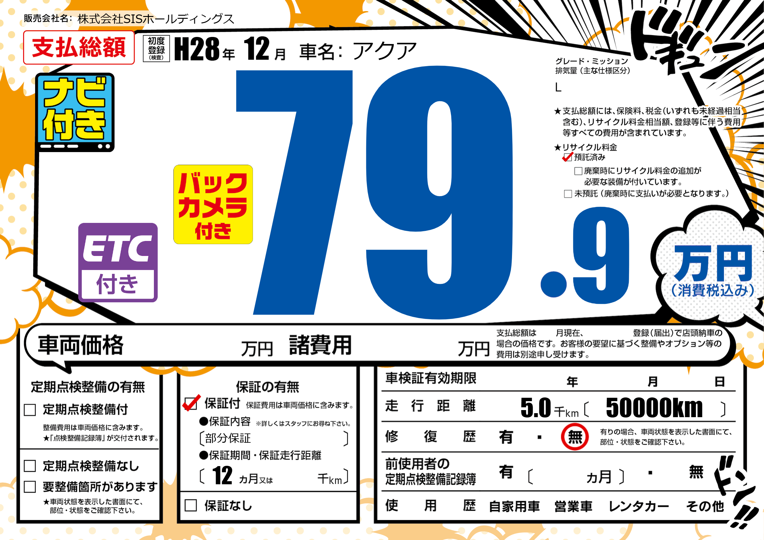 | 走行キロ | 0.5万km | 初年度登録 | H28年12月 |