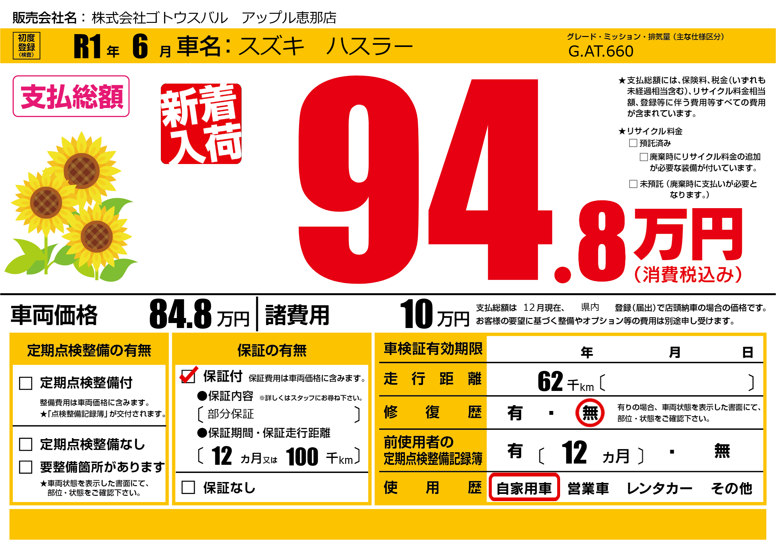 | 車名 | スズキ ハスラー | グレード ミッション 排気量 |