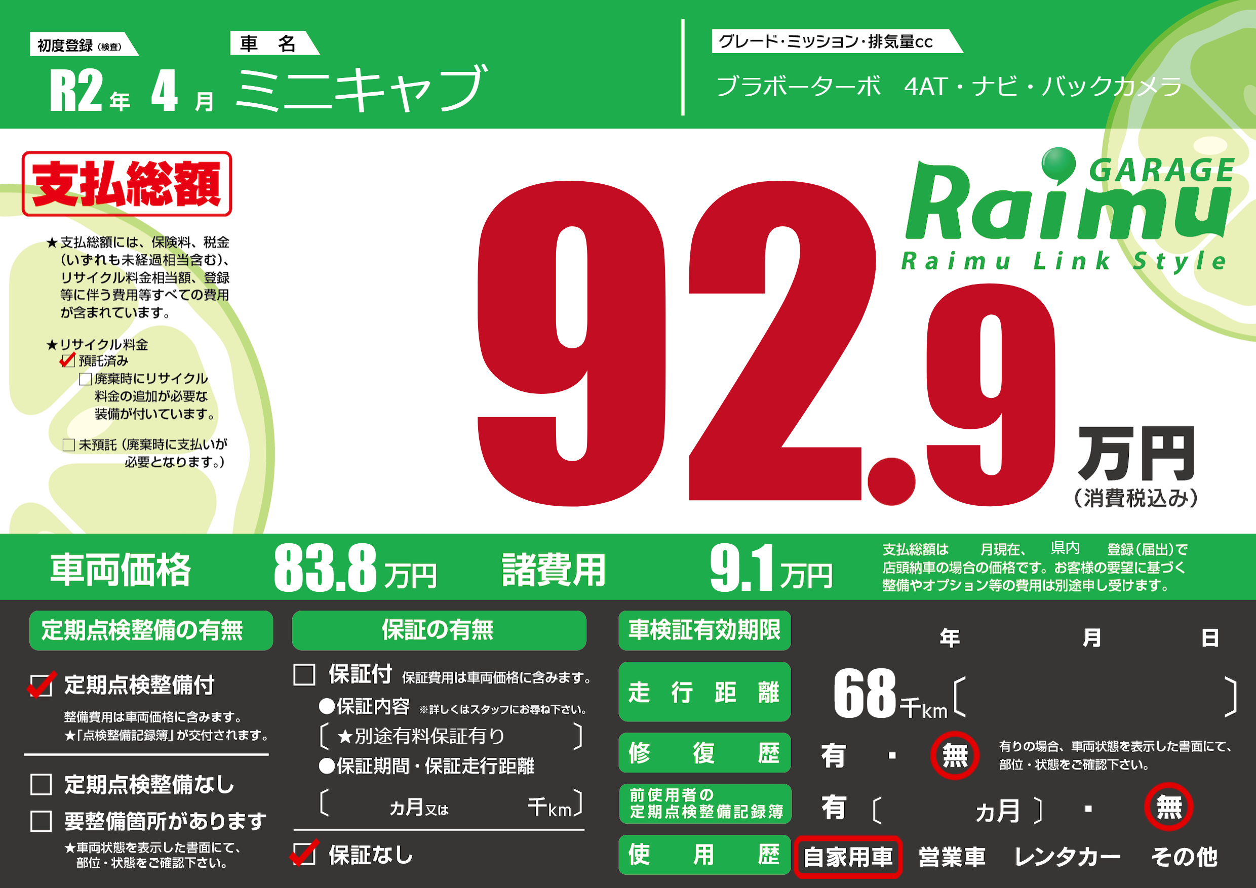 保証なし 保証内容(★別途有料保証有り) ---ヶ月または()千kmまで |