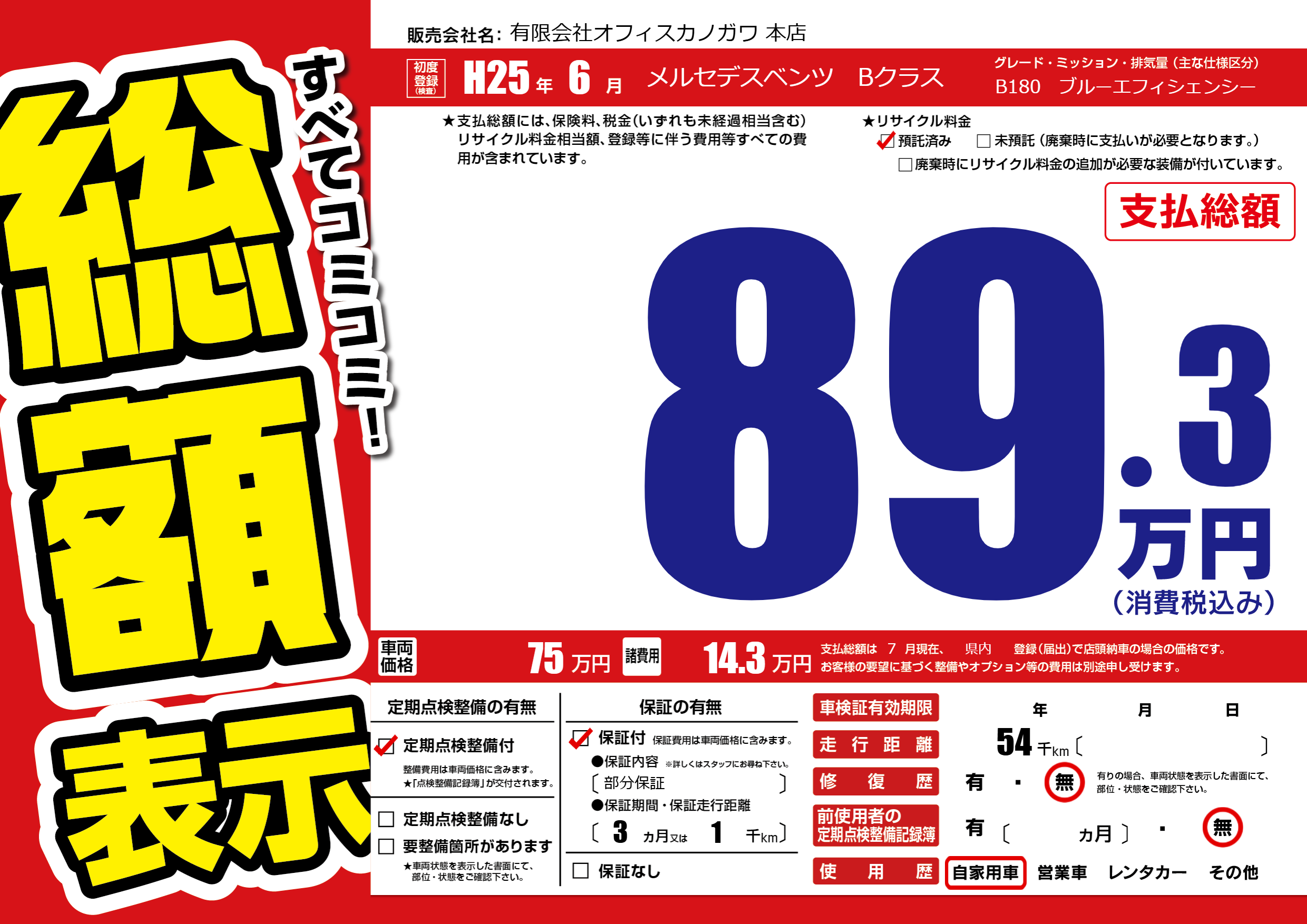 | 車名 | メルセデスベンツ Bクラス | グレード ミッション 排気量 |