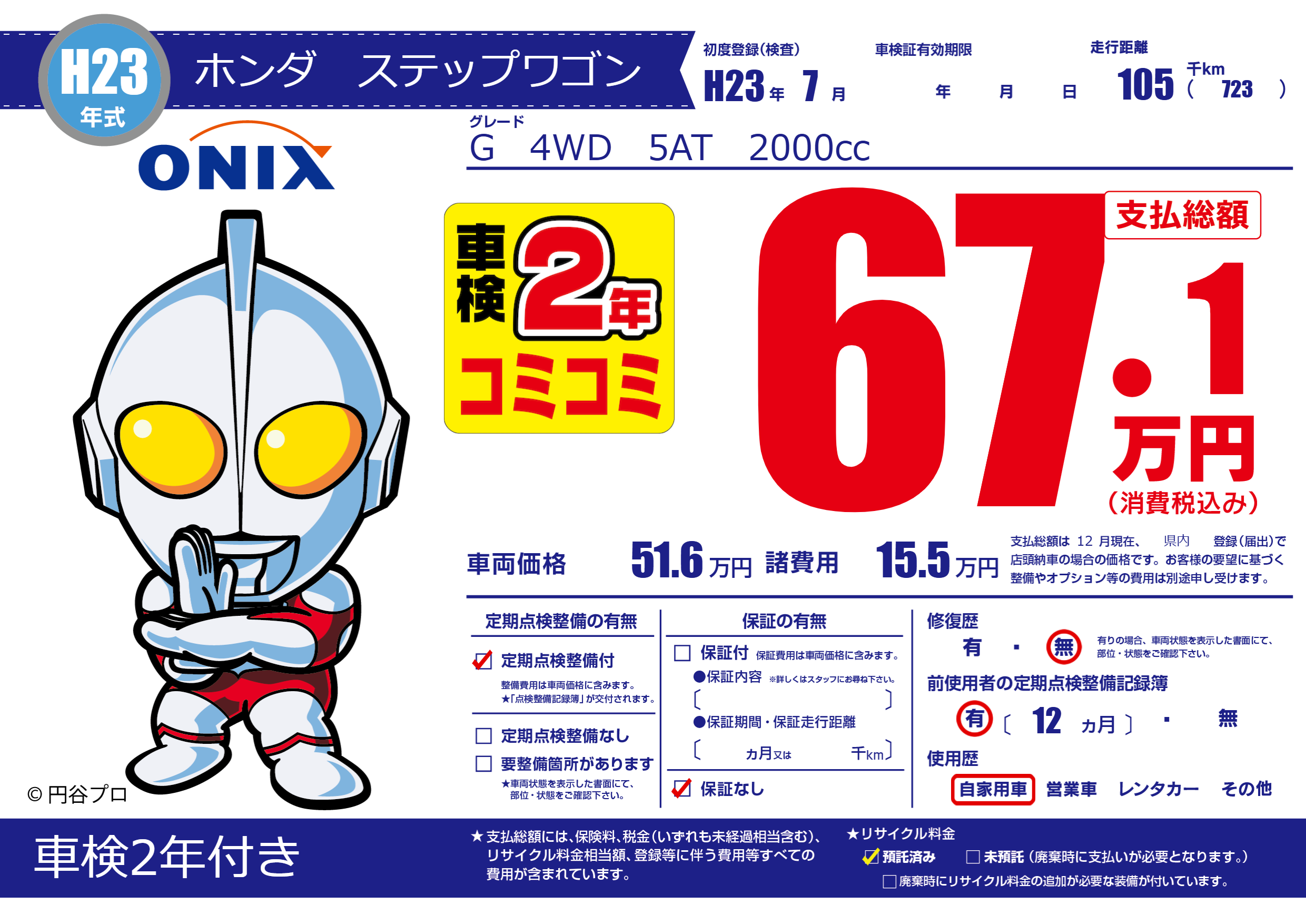 | 走行キロ | 10.5万km | 初年度登録 | H23年7月 |