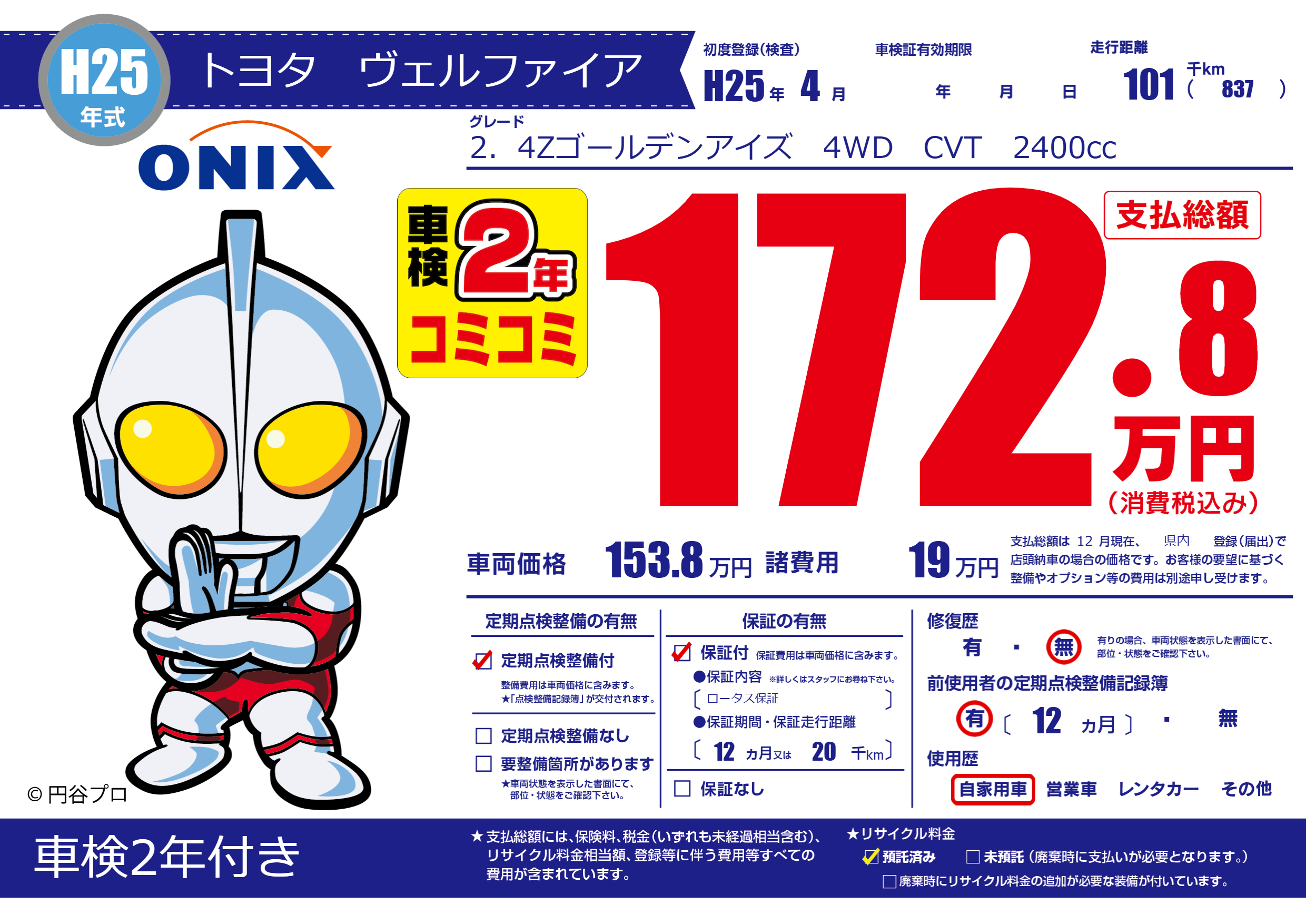 | 車名 | トヨタ ヴェルファイア | グレード ミッション 排気量 |