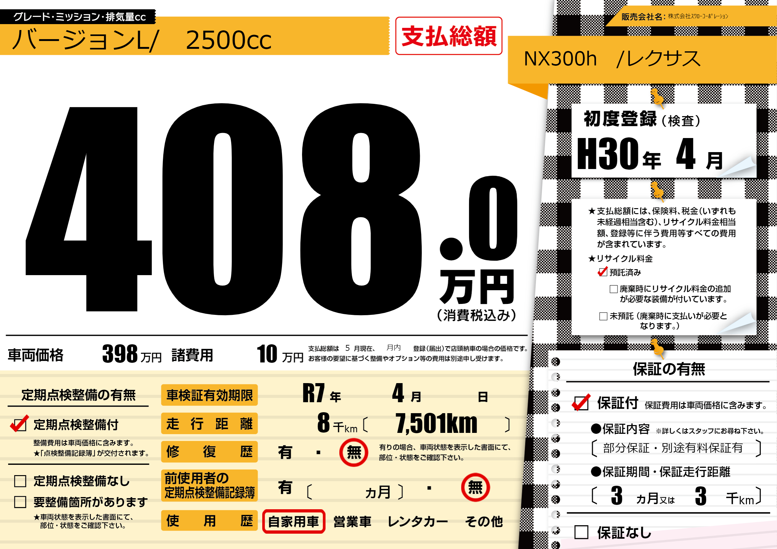 | 車名 | NX300h /レクサス | グレード ミッション 排気量 |