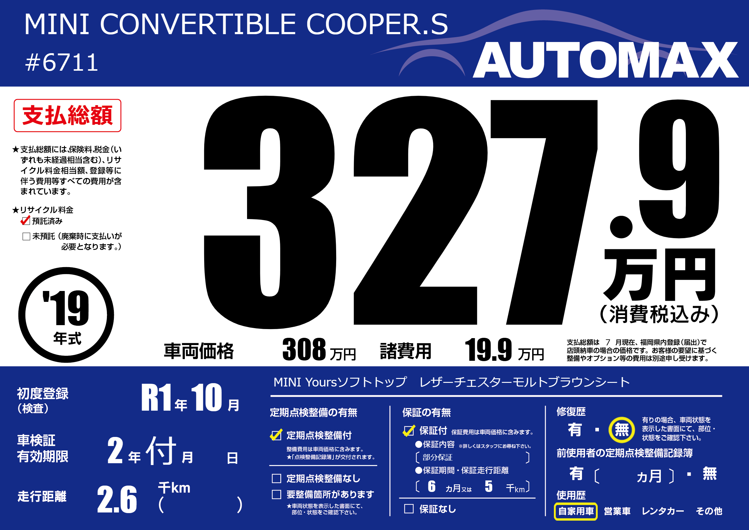 | 車名 | MINI CONVERTIBLE COOPER.S | グレード ミッション 排気量 |