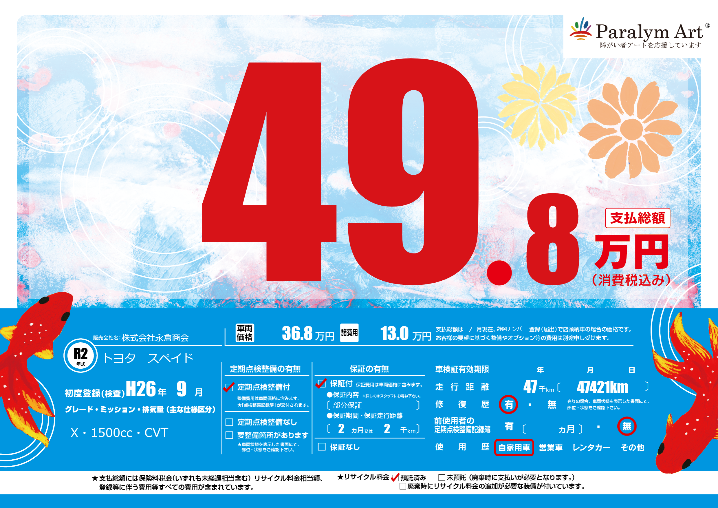 | 車名 | トヨタ スペイド | グレード ミッション 排気量 |