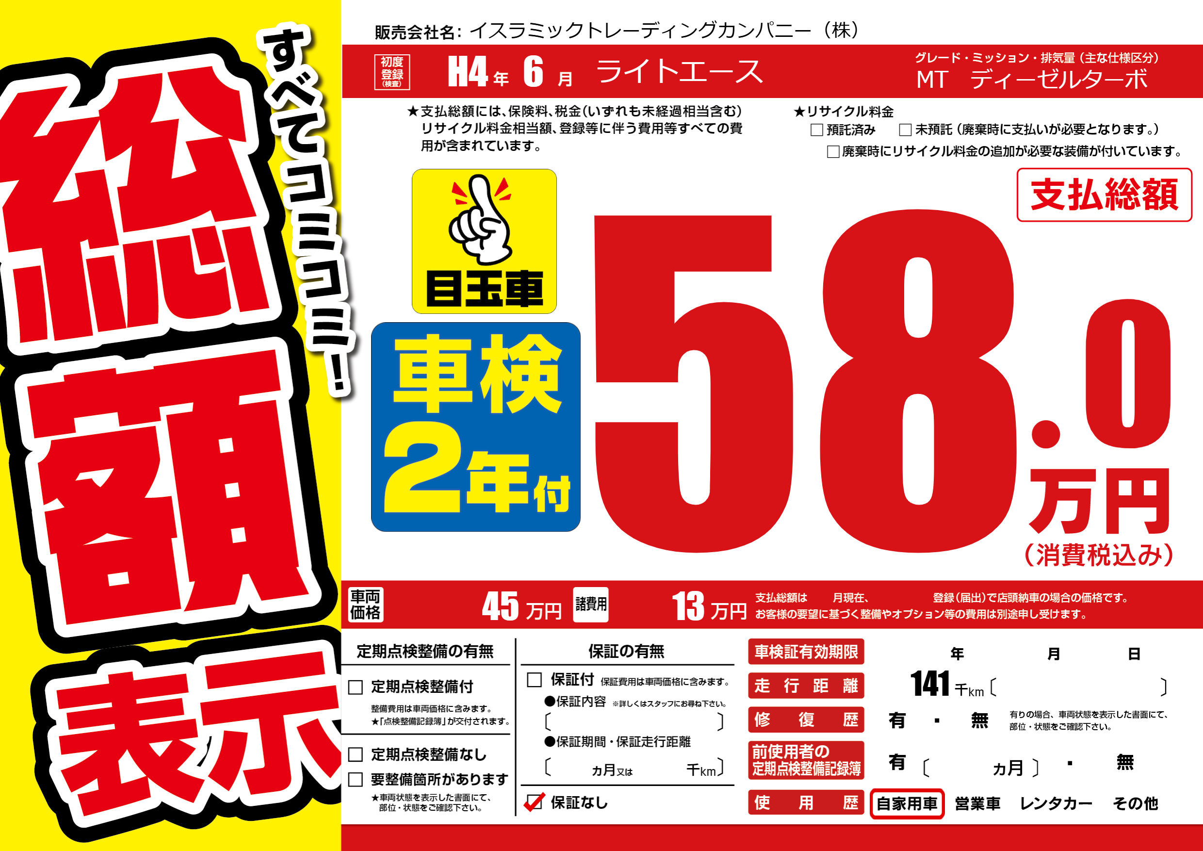 | 走行キロ | 14.1万km | 初年度登録 | H4年6月 |