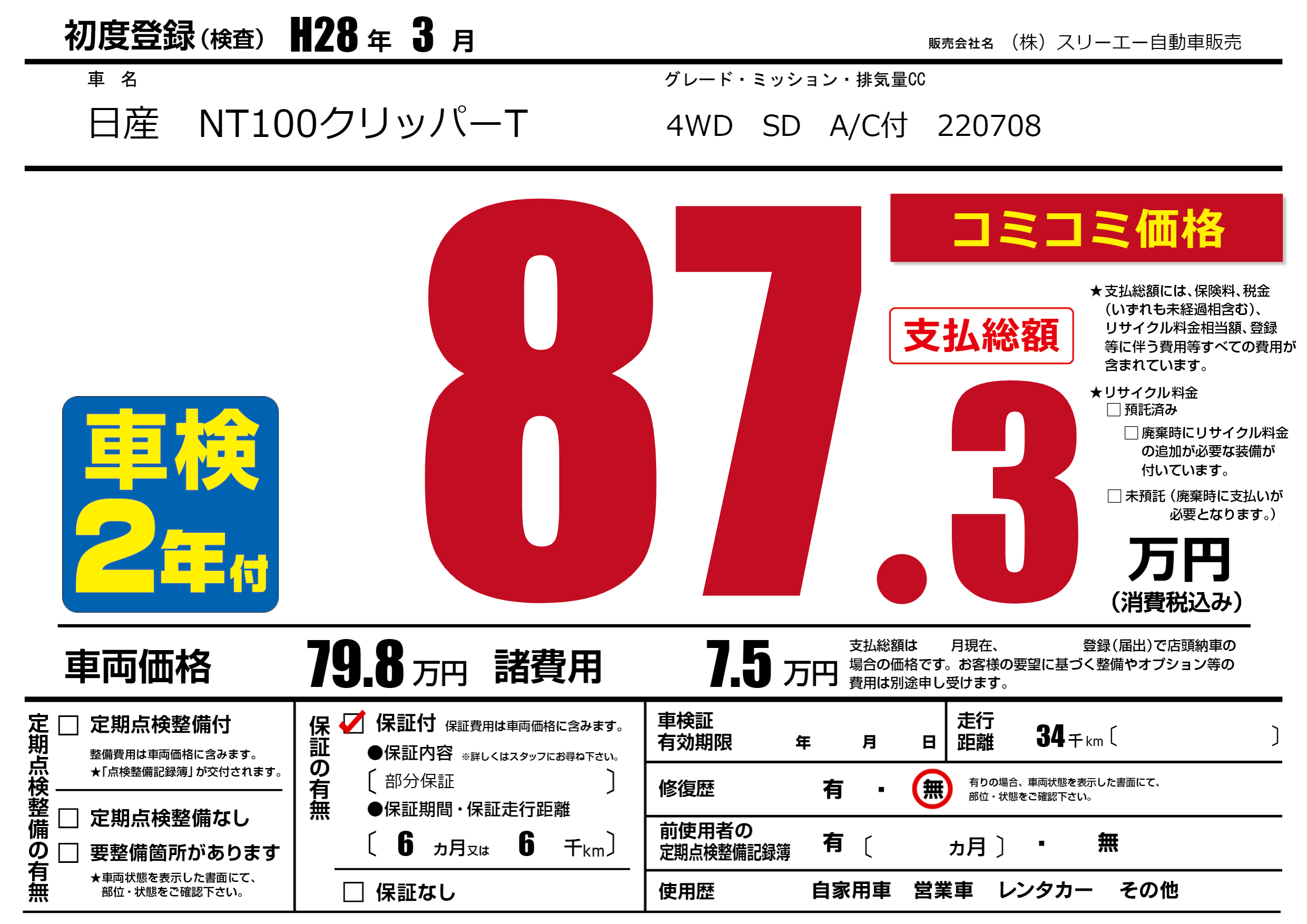 保証付き 保証内容(部分保証) 6ヶ月または(6)千kmまで |