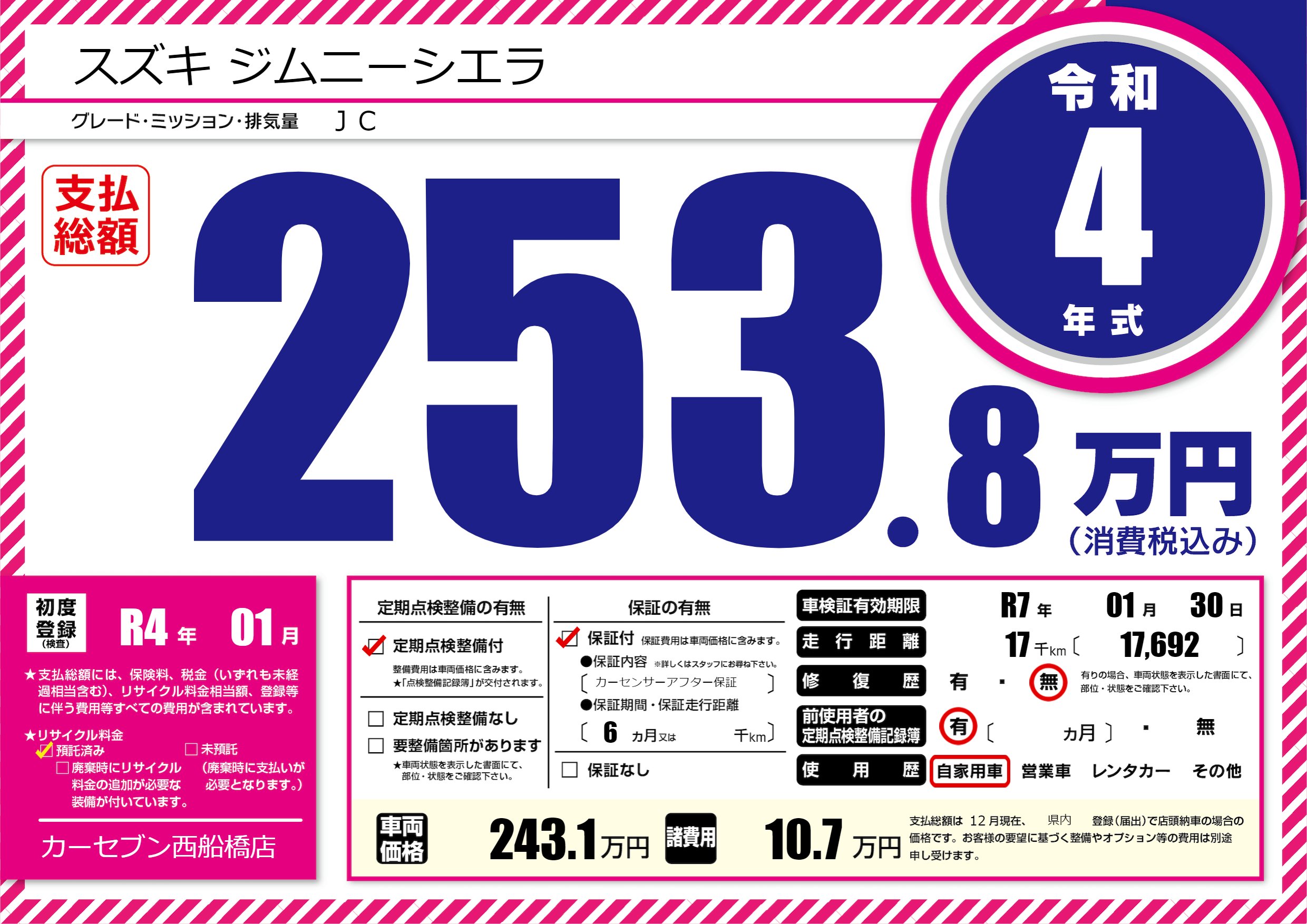 | 車名 | スズキ ジムニーシエラ | グレード ミッション 排気量 |
