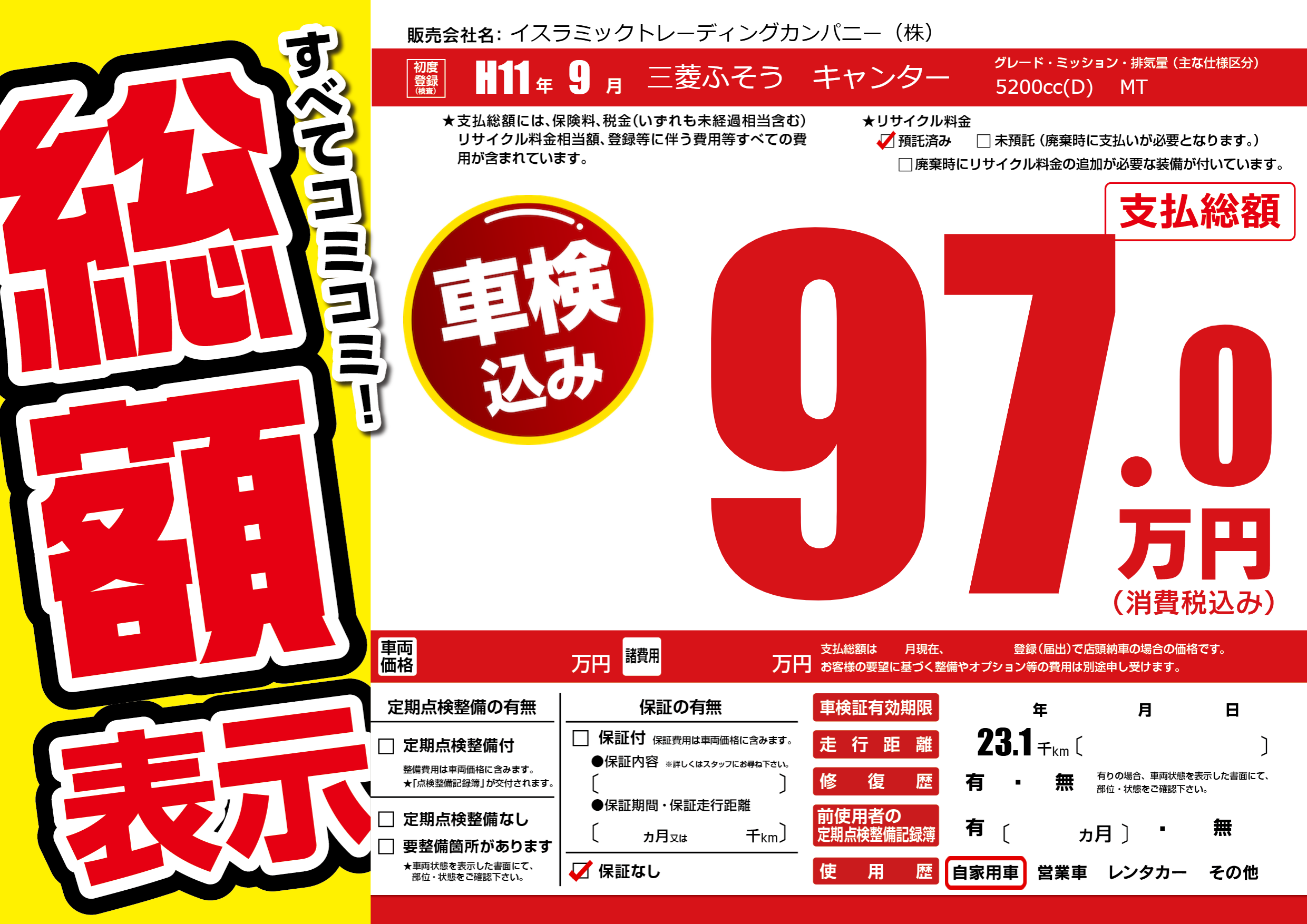 | 車名 | 三菱ふそう キャンター | グレード ミッション 排気量 |