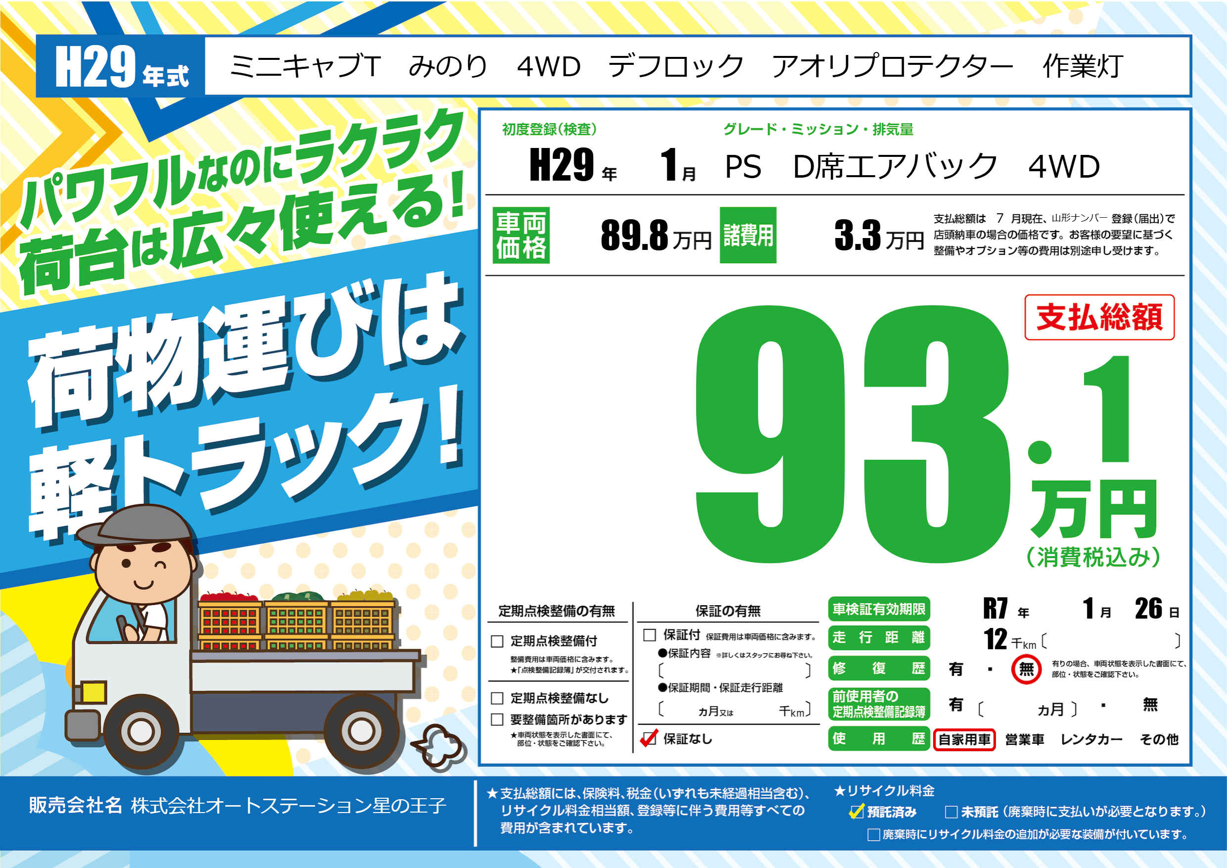| 車名 | ミニキャブT みのり 4WD デフロック アオリプロテクター 作業灯 | グレード ミッション 排気量 |
