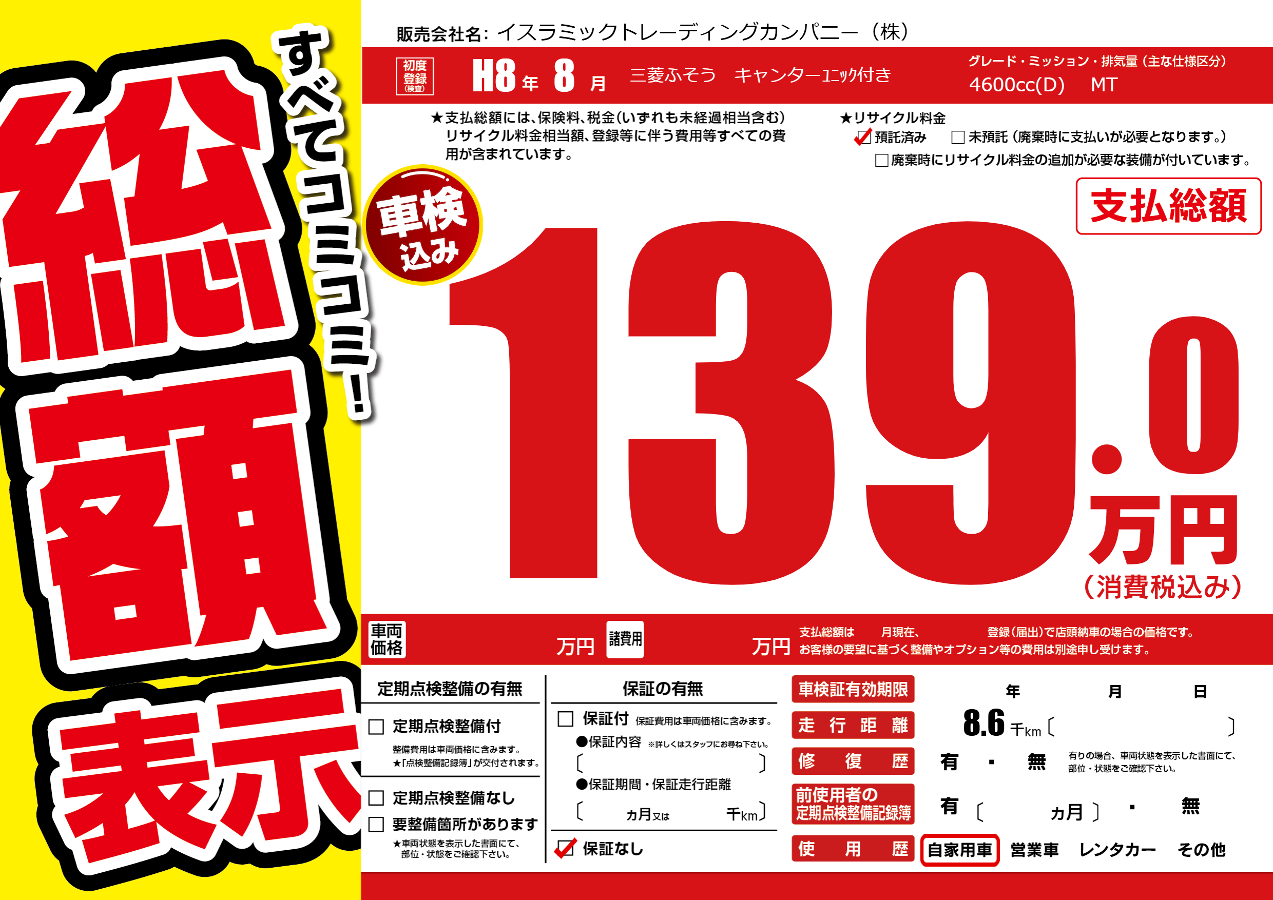 | 走行キロ | 0.8万km | 初年度登録 | H8年8月 |
