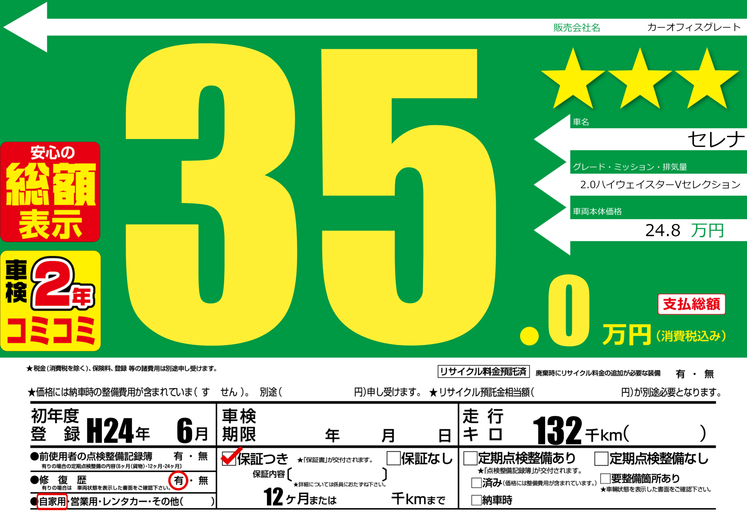 | 走行キロ | 13.2万km | 初年度登録 | H24年6月 |