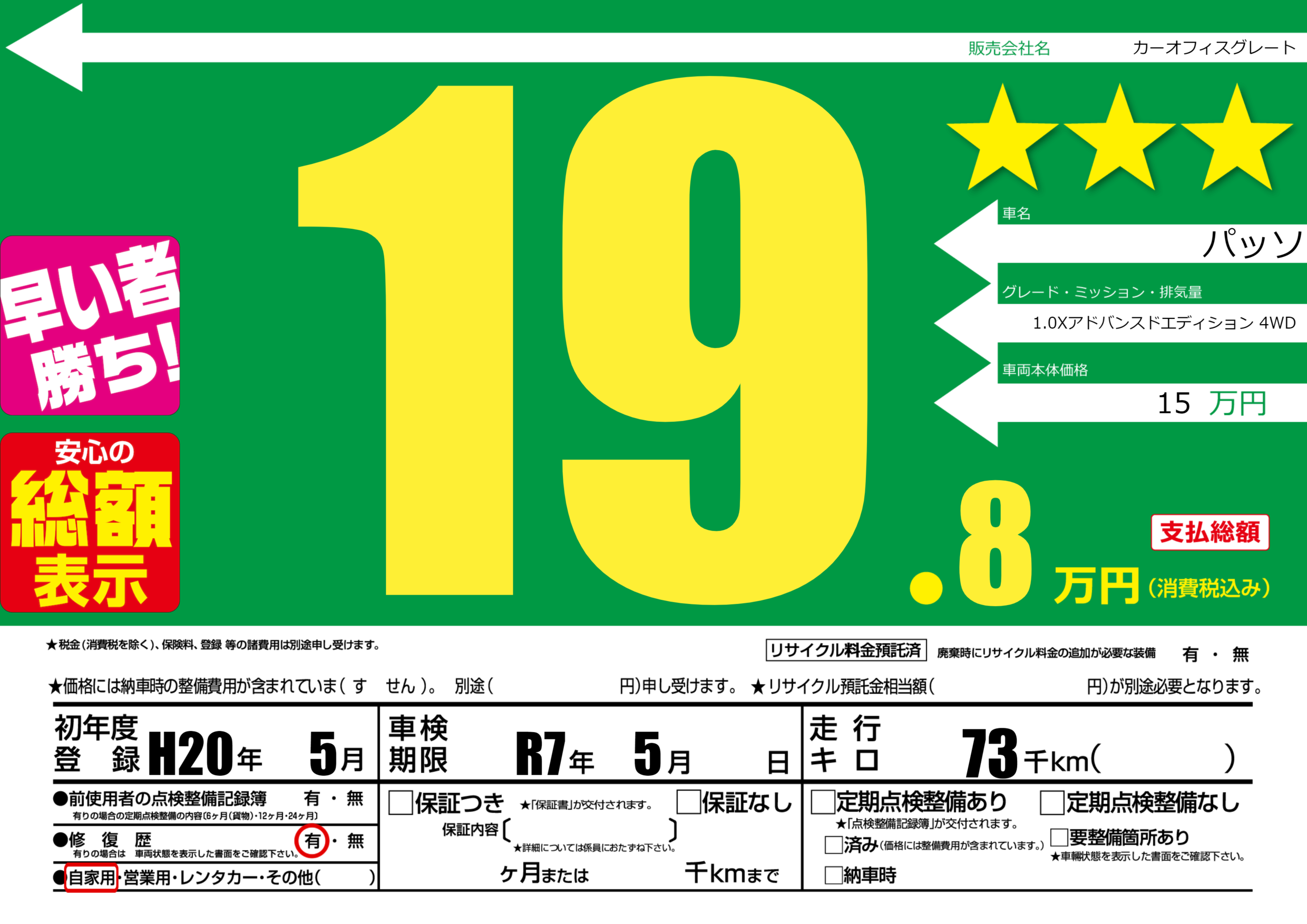 | 車名 | パッソ | グレード ミッション 排気量 |