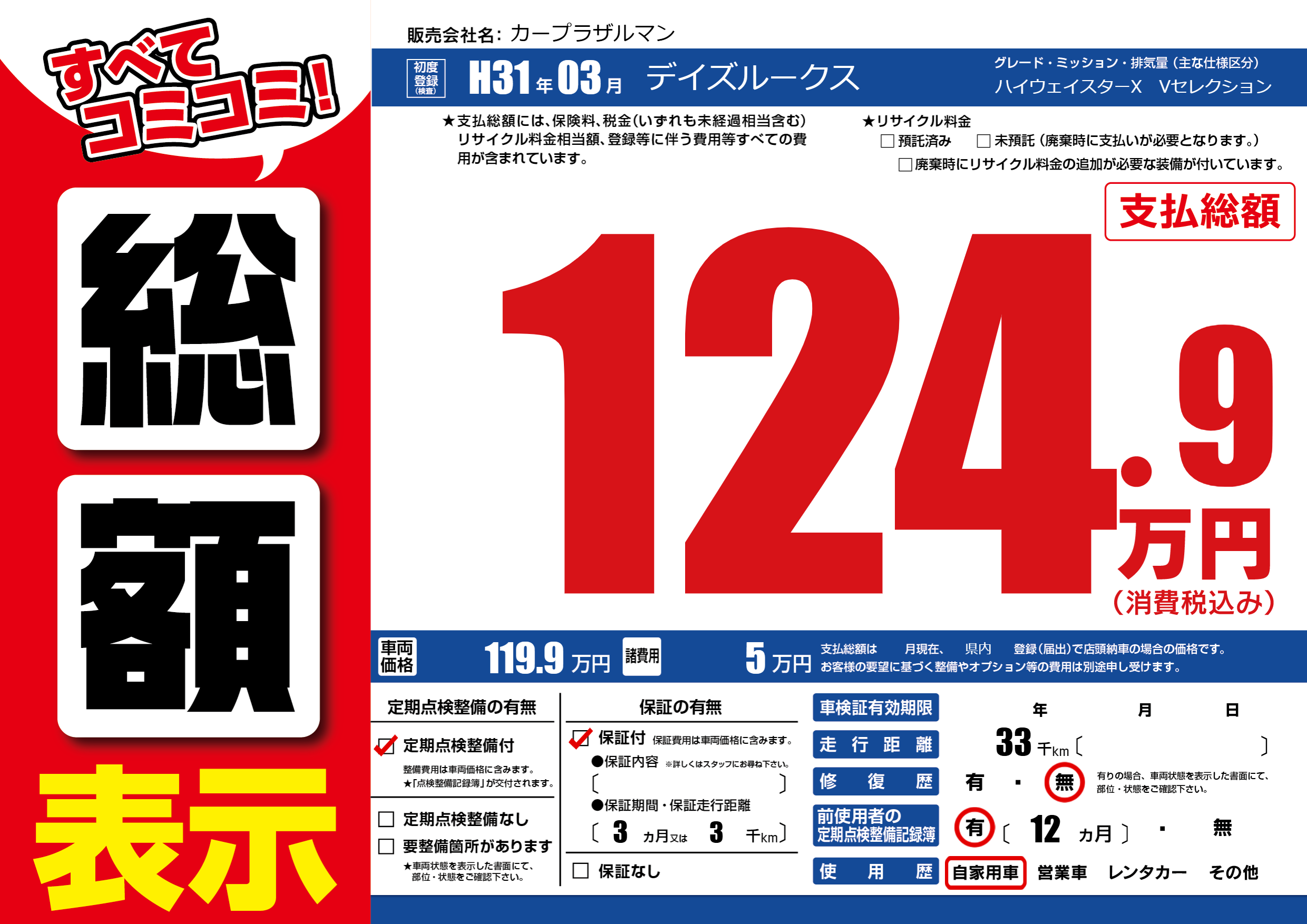 | 走行キロ | 3.3万km | 初年度登録 | H31年03月 |