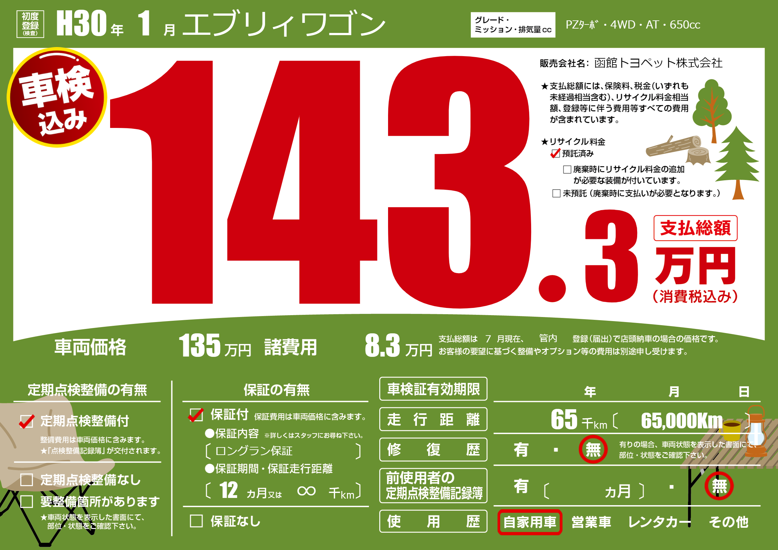 | 走行キロ | 6.5万km | 初年度登録 | H30年1月 |