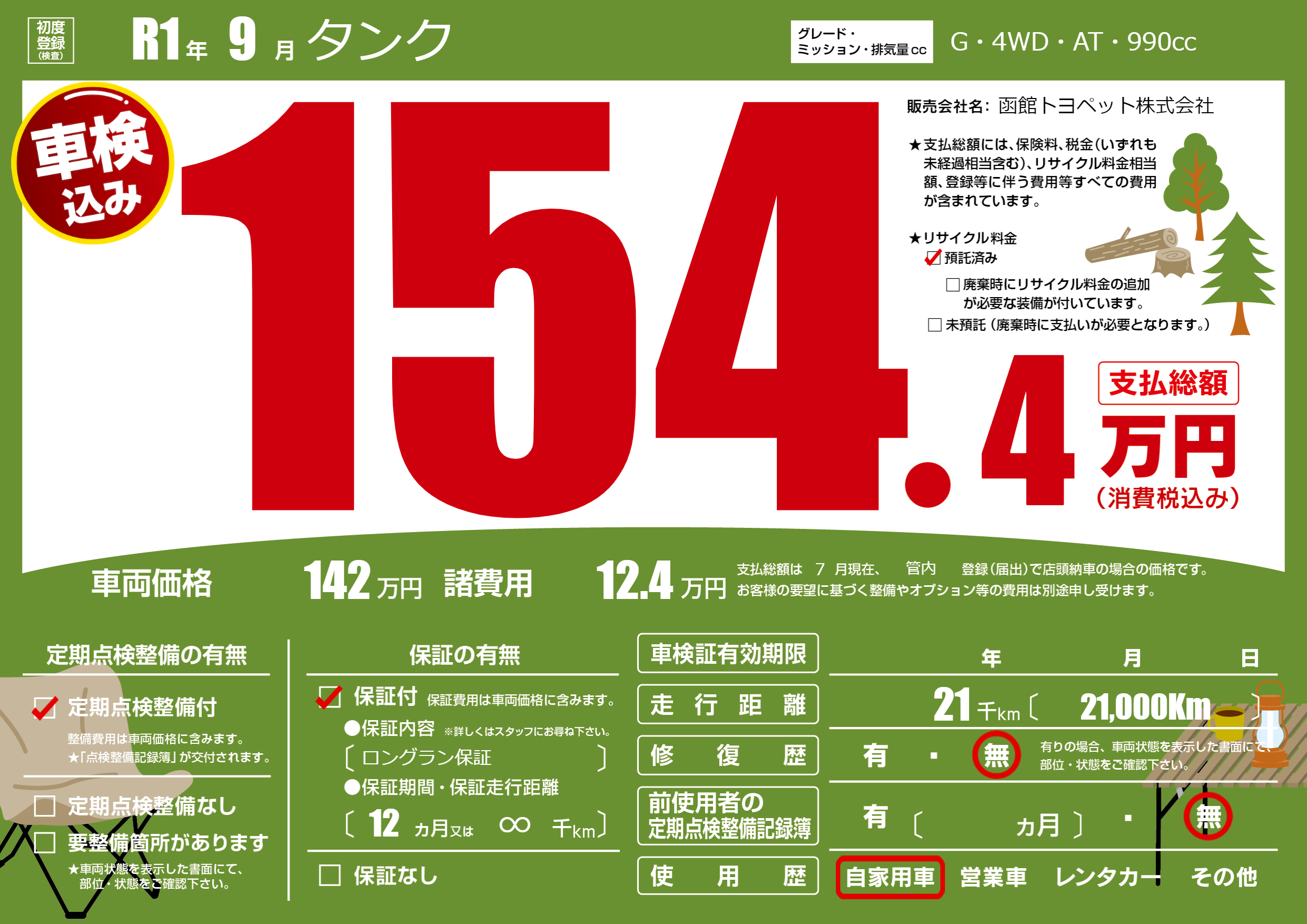 | 走行キロ | 2.1万km | 初年度登録 | R1年9月 |